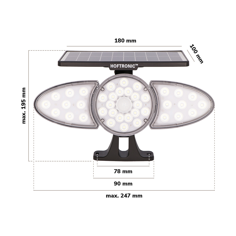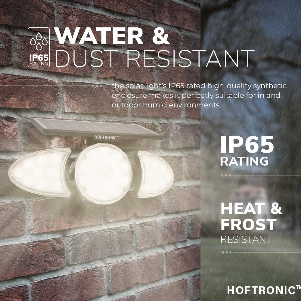 De LED Solar Tuinspot Fulco is niet zomaar een buitenverlichting op zonne-energie, de Fulco is kenmerkend door zijn bewegingssensor met een bereik tot wel 5 meter! Hierom wordt de Fulco de toezichthouder van je tuin zogenoemd, elke beweging tot en met 5 meter wordt door de LED wandlamp Fulco geaccentueerd met zijn 6000K helder daglicht wit licht! De 3 diverse spotlights kun je afstellen naar je eigen behoeftes, doordat de deze diverse lichtstanden heeft en vanwege de verstelbare zijkanten van de wandspot. Deze kun je naar binnen en buiten draaien, waardoor je de lichtbundel kan richten waar je wilt.