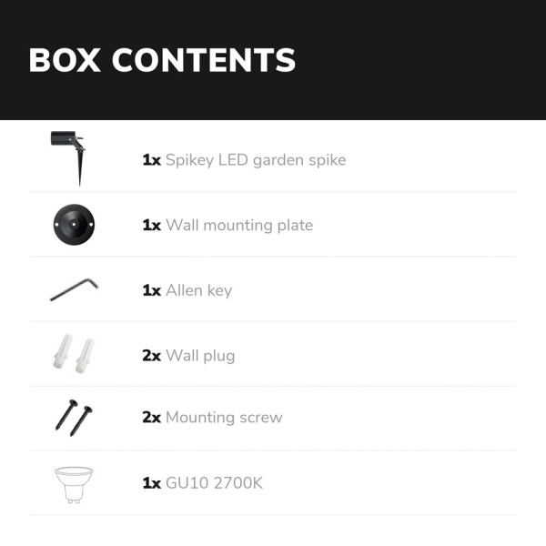Bij deze Spikey zit al een lichtbron. Deze dimbare GU10 met 2700K warm wit licht is uitmuntend voor het creëren van meer sfeer op donkere dagen. Natuurlijk kun je deze lichtbron probleemloos substitueren via de schroefdraad in de tuinspot. Hierdoor hoef je de gemonteerde prikspot niet van de muur te halen of uit de aarde te trekken. Een groot voordeel hiervan is natuurlijk dat je niet de hele lamp hoeft te omruilen bij een potentieel defect. Een ander groot voordeel is dat je de Spikey mede kunt voorzien van een andere lichtkleur of slimme lichtbronnen, onder andere Philips Hue en onze HOFTRONIC Smart GU10.