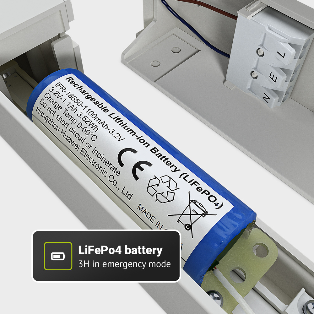 Als de stroom uitvalt en de verlichting niet meer werkt, hoef je je dankzij deze noodverlichting geen zorgen te maken. De Tumu is uitgerust met een betrouwbare LiFePO4 back-up batterij die tot wel 3 uur kan branden. Deze batterij is in huis 24 uren helemaal opgeladen. De noodverlichting schakelt automatisch in wanneer de stroom uitvalt. In gevaarlijke situaties met uitsluiting van stroom zal de noodverlichting op de batterij blijven werken.