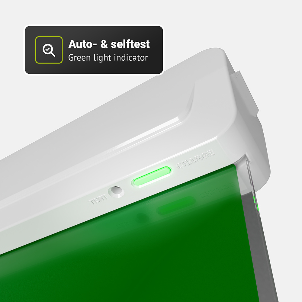 Het nooduitgang bord heeft een handige autotestfunctie. Dankzij de autotestfunctie voert de lamp elke maand en elk jaar automatisch een zelftest uit. Als de lamp niet goed functioneert, zal een rode led-indicator gaan branden of knipperen. Dit verhoogt niet alleen de securiteit, maar bespaart ook tijd omdat je de lamp niet meer elke maand handmatig hoeft te uitproberen. De Tumu wordt geleverd met 2 verscheidene vluchtwegstickers (een pijl naar links en een pijl naar rechts). Extra stickers, zoals een pijl naar boven of onder zijn als set apart bij te bestellen. Deze noodverlichting verbruikt slechts 2,2 watt en schijnt een helder 6500K daglicht wit licht waarmee hij in alle situaties prima waarneembaar is.