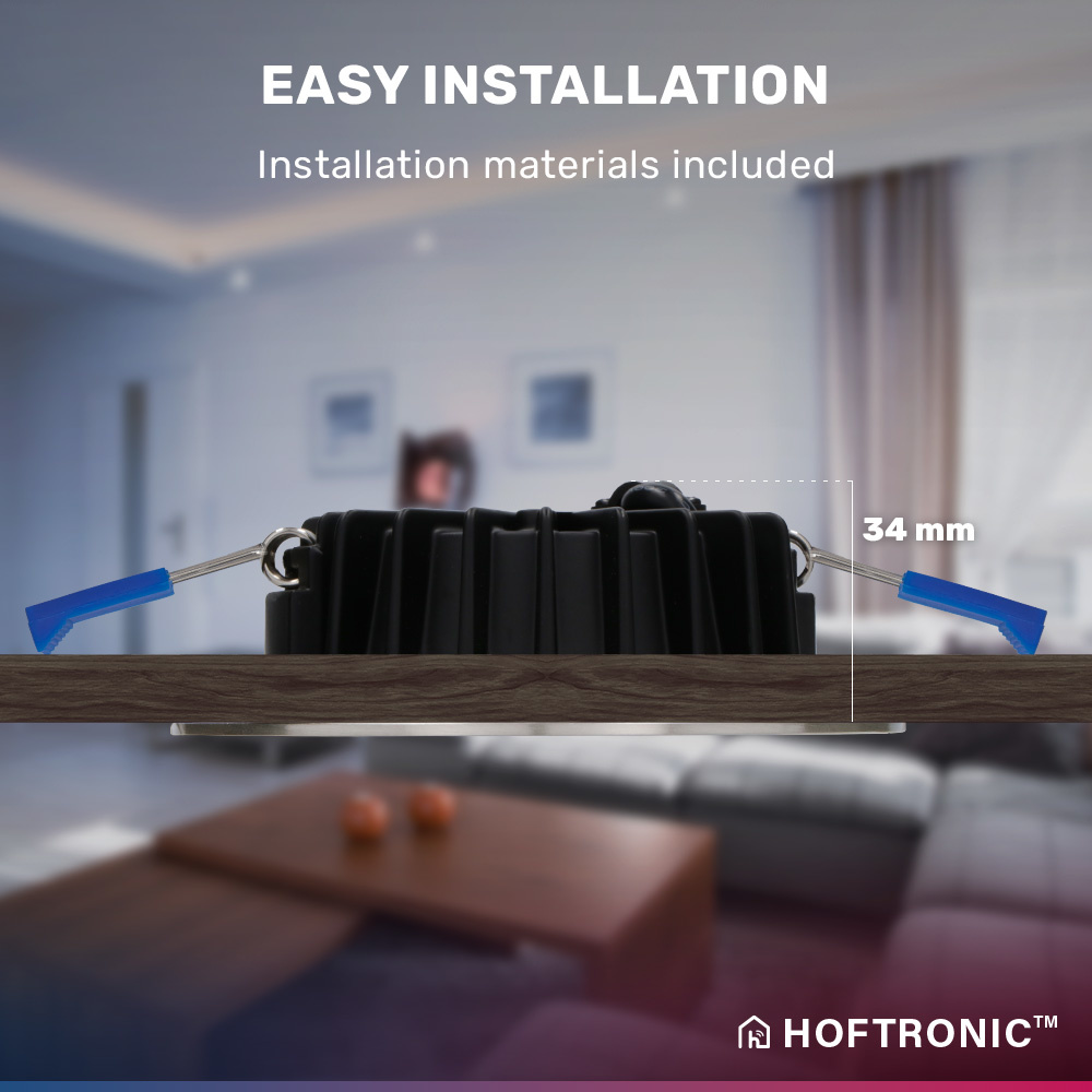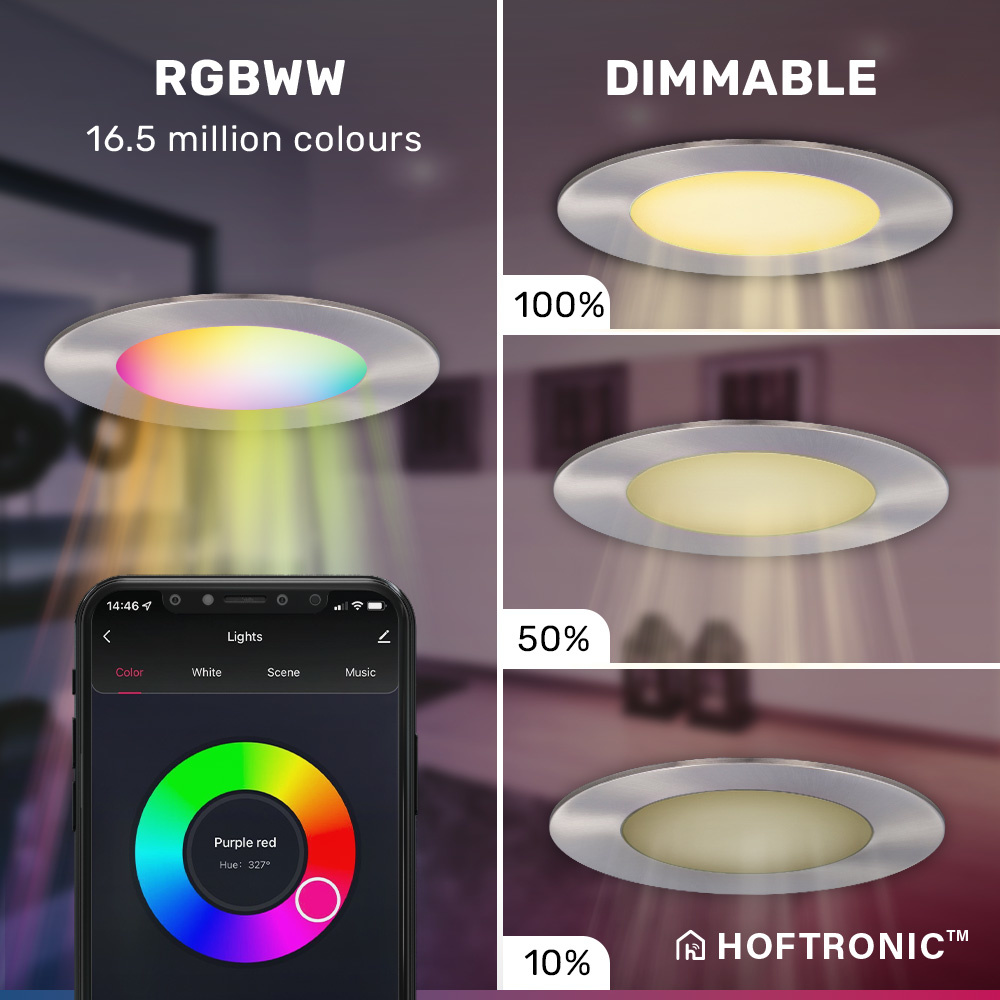Door de Quick-connector fitting zijn de 12 Watt RGBWW LED inbouwspots comfortabel en spoedig te installeren. De spots zijn slimme producten, wat betekent dat ze te koppelen zijn aan andere slimme producten. Via de WIFI zijn ze koppelbaar aan je telefoon of tablet, en via de Hoftronic Smart app kun je de spots aangenaam bedienen, waar en wanneer je wilt.