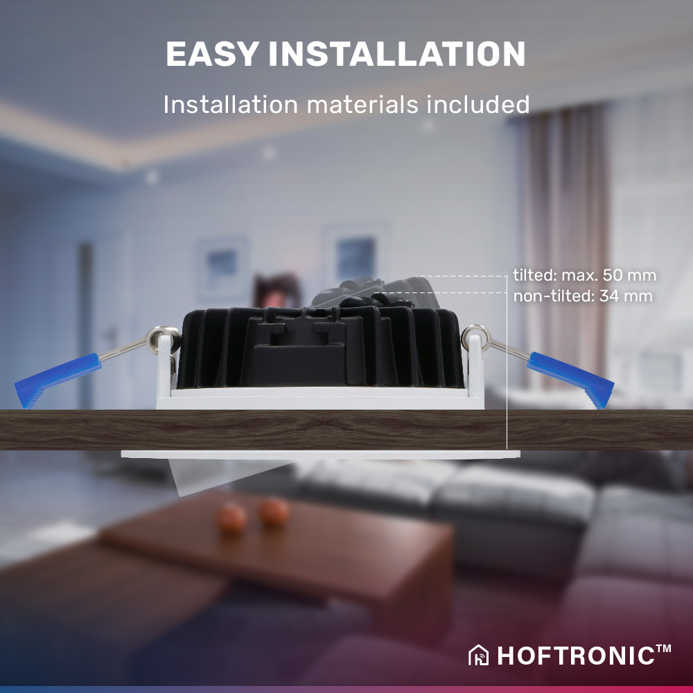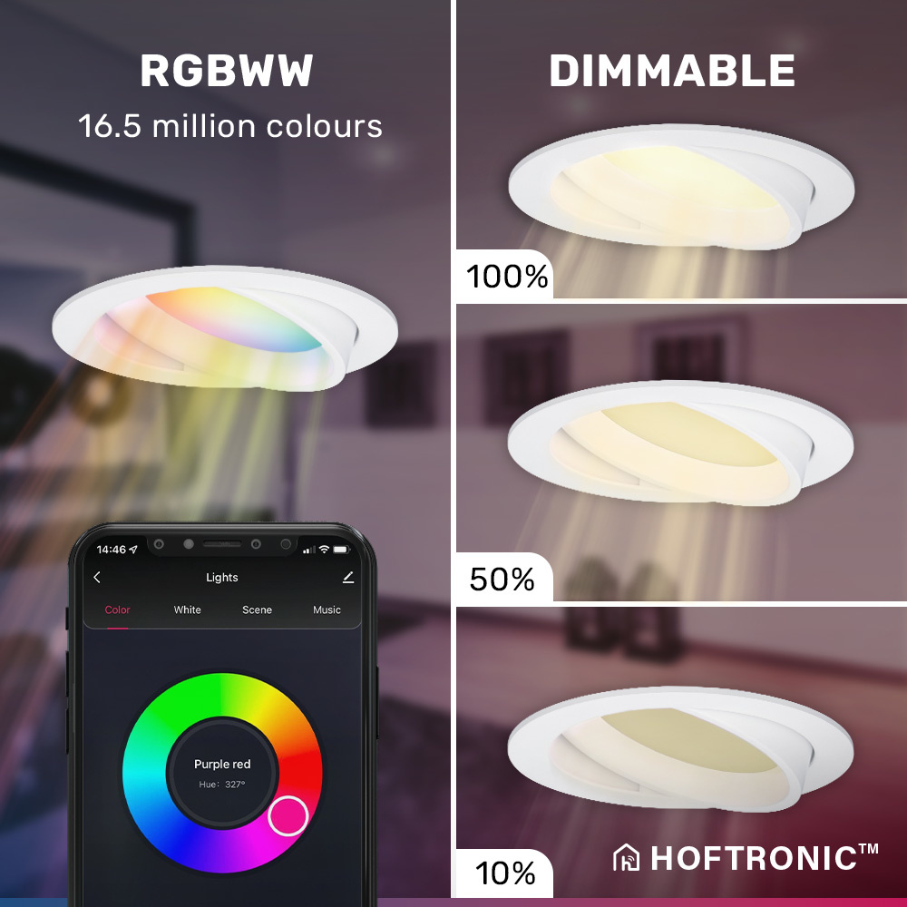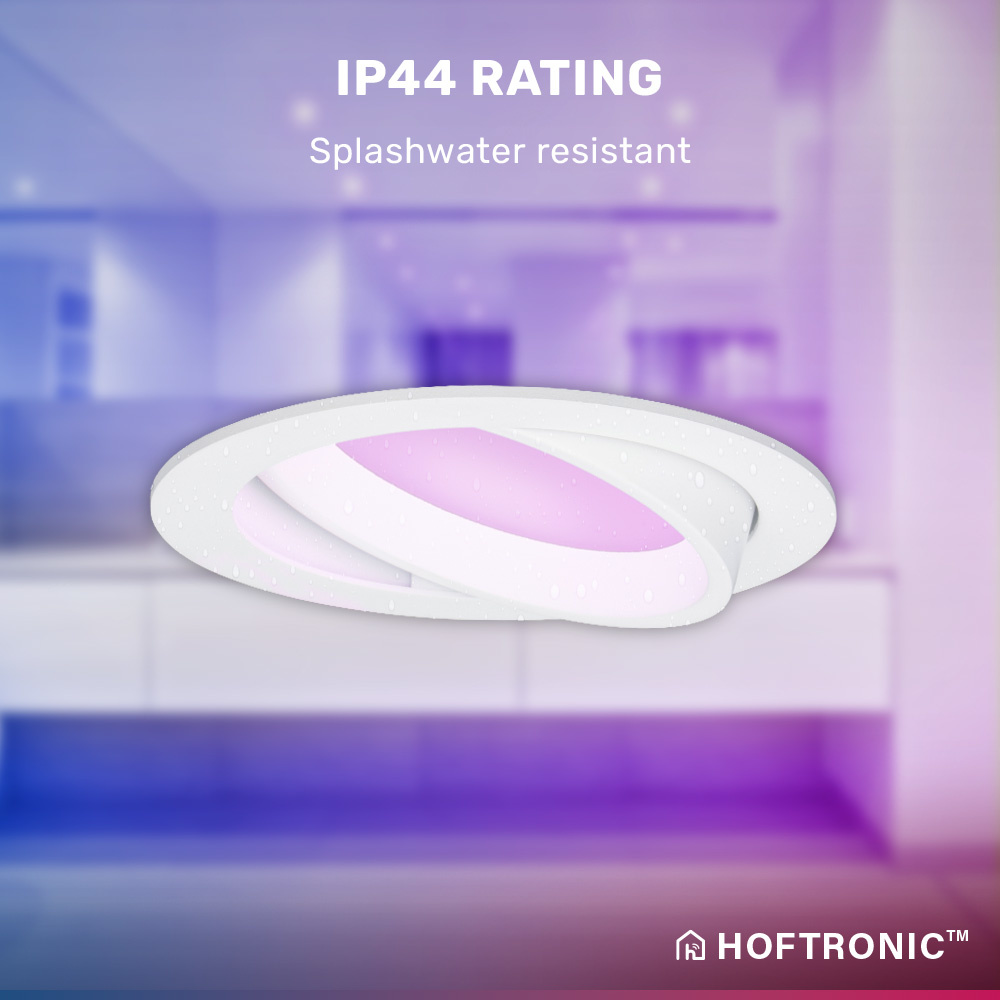 Deze kantelbare smart home inbouwspots schijnen 16,5 miljoen kleuren. De spots beschikken over een extra hoge lichtopbrengst van 1050 lumen. Hierdoor schijnen de plafondspots ook ingesteld op donkere kleuren fel voldoende om vertrekken maximaal te van licht voorzien. Doordat de slimme inbouwspots hanteer maken van WiFi & Bluetooth lukt het verbinden met je smartphone altijd. De Luna beschikken over een IP44 beschermingsklasse. Hierdoor hebben ze geen last van vocht en stof. Dit maakt ze ook bekwaam als badkamer inbouwspots.
