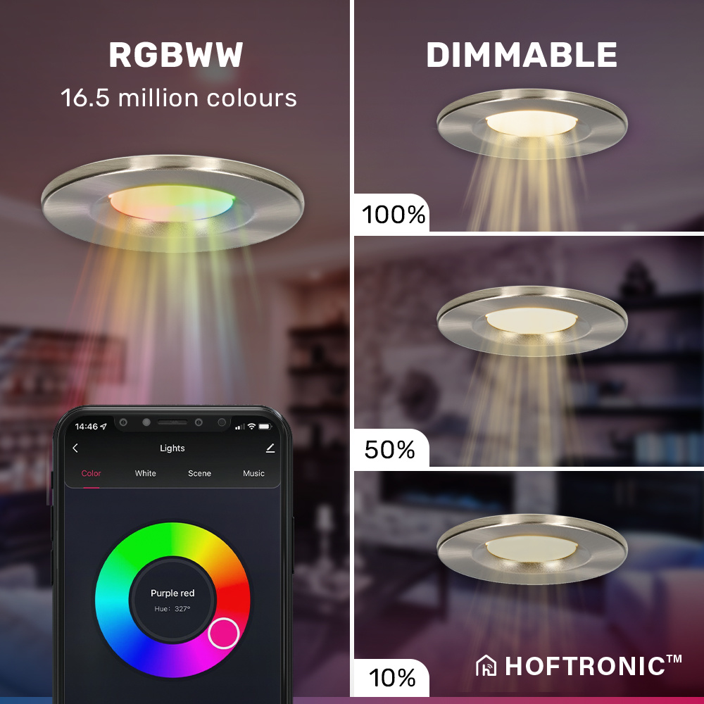 Vanwege de quick-connector zijn de LED RGBWW smart inbouwspots snel en eenvoudig te installeren. De slimme spots zijn te bedienen via de Hoftronic Smart App, waarbij je telefoon of tablet kan dienen als afstandsbediening. Bepaal de lichtkleur, lichtintensiteit, of stel een timer in opdat de lampen automatisch aan en uit gaan.