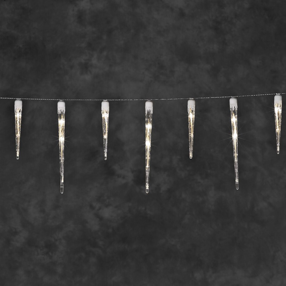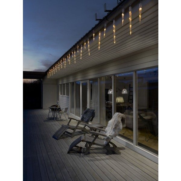 De ijspegelverlichting werkt op 24 volt en kan dankzij de waterdichte transformator onmiddelijk op de stroom worden aangesloten. Aan de verlichting vind je een 1000 centimeter lange voedingskabel die ervoor waakt dat de verlichting overal in je tuin opgehangen kan worden. In compleet telt deze ijsregen verlichting 24 zomers witte LEDs die in de 16 ijspegels verwerkt zijn.