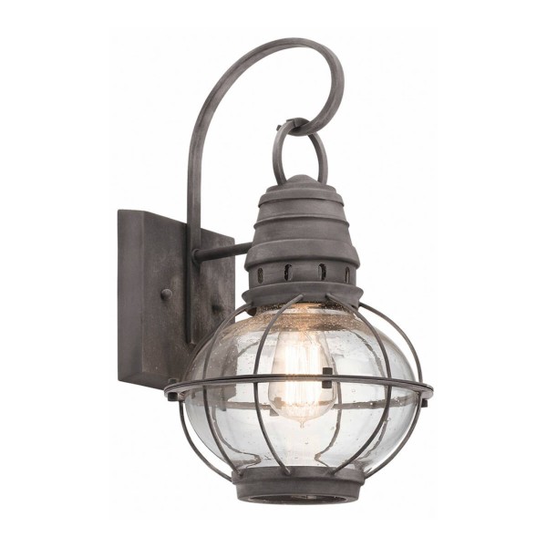 Industrieel ontworpen buiten-wandlantaarn Bridge Point De buitenwandlamp Bridge Point in traditionele lantaarnvorm vervult niet alleen zijn doel om een optimale verlichting van een voorgevel te bieden, maar roept door zijn technische ontwerp ook herinneringen op aan muurlampen zoals die vroeger in scheepvaart- of treinstations werden gebruikt. De bolvormige glazen kap zorgt met zijn patroon, helder glas, voor een allround sfeer-verlichting. Een wandlamp die perfect is als entreeverlichting voor een huis, winkel of zelfs een antiek ontworpen restaurant.