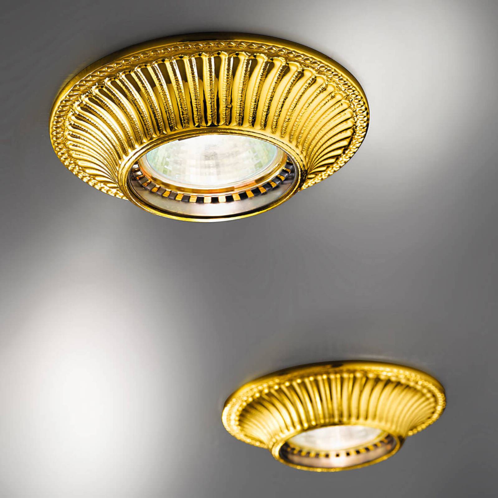 Klassieke inbouwspot Milord in drie kleuren De inbouwspot Milord van Kolarz is bewerkt met een elegant en klassiek raamwerk die aan de buitenkant met diverse inkepingen, weelderig is versierd. De inbouwspot is een krachtige halogeenspot, die in de kleuren goud (24-karaats), frans goud (24-karaats) en oud messing leverbaar is.