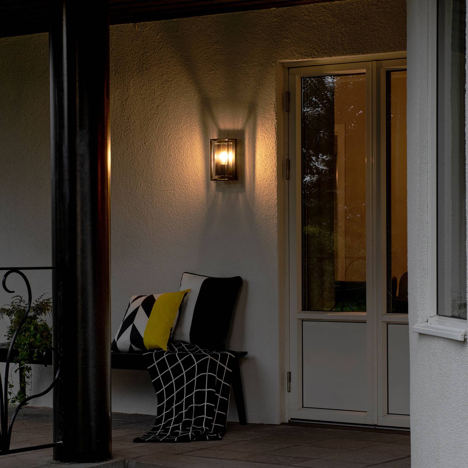 Brindisi – moderne buitenwandlamp met helder glas De modern vormgegeven buitenwandlamp Brindisi bestaat uit een frame van zwart gelakt aluminium en een interne kap van helder glas. De te gebruiken lichtbron wordt hier openlijk getoond en maakt daarom deel uit van het moderne design. Moderne retrofit- of gloeilampen zijn hier bijvoorbeeld zeer geschikt, omdat ze een decoratief element zijn dat dat speciale tintje toevoegt. Als het licht aan is, creëert Brindisi een elegant lichtspel op de muur. Zeer goed toepasbaar op bijvoorbeeld terrassen of in de buurt van de ingang van het huis.