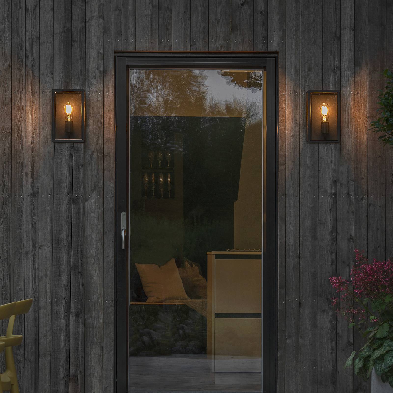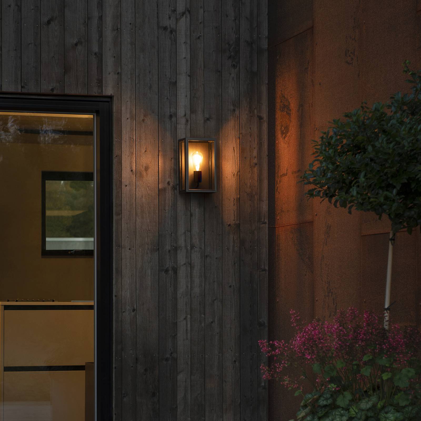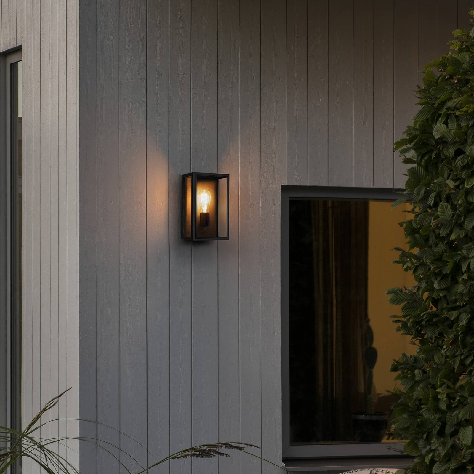 Carpi kubusvormige wandlamp voor buiten met helder glas Deze wandlamp voor buiten vormt de perfecte basis om een decoratief lichtaccent toe te voegen aan een moderne buitenruimte. Carpi is ontworpen als een open, zwarte kubus. De gesloten achterkant en de stutten aan de voorkant zijn gemaakt van aluminium en afgewerkt met een zwarte poedercoating. De oppervlakken zijn bekleed met doorzichtige glasplaten die zicht geven op de lichtbron, die in de naar boven gerichte fitting is geplaatst. Optisch harmonieuze lampen zijn verkrijgbaar via de accessoires.