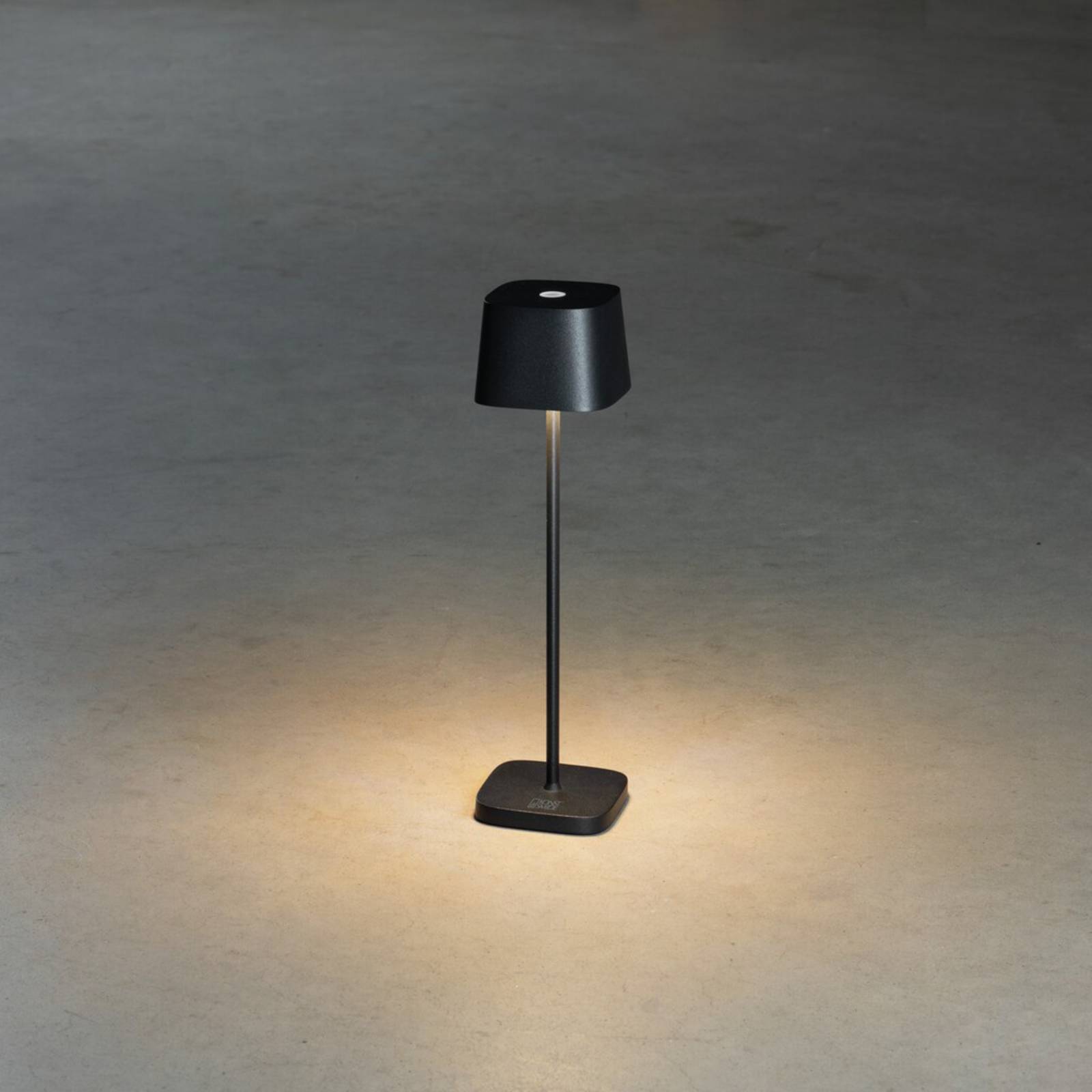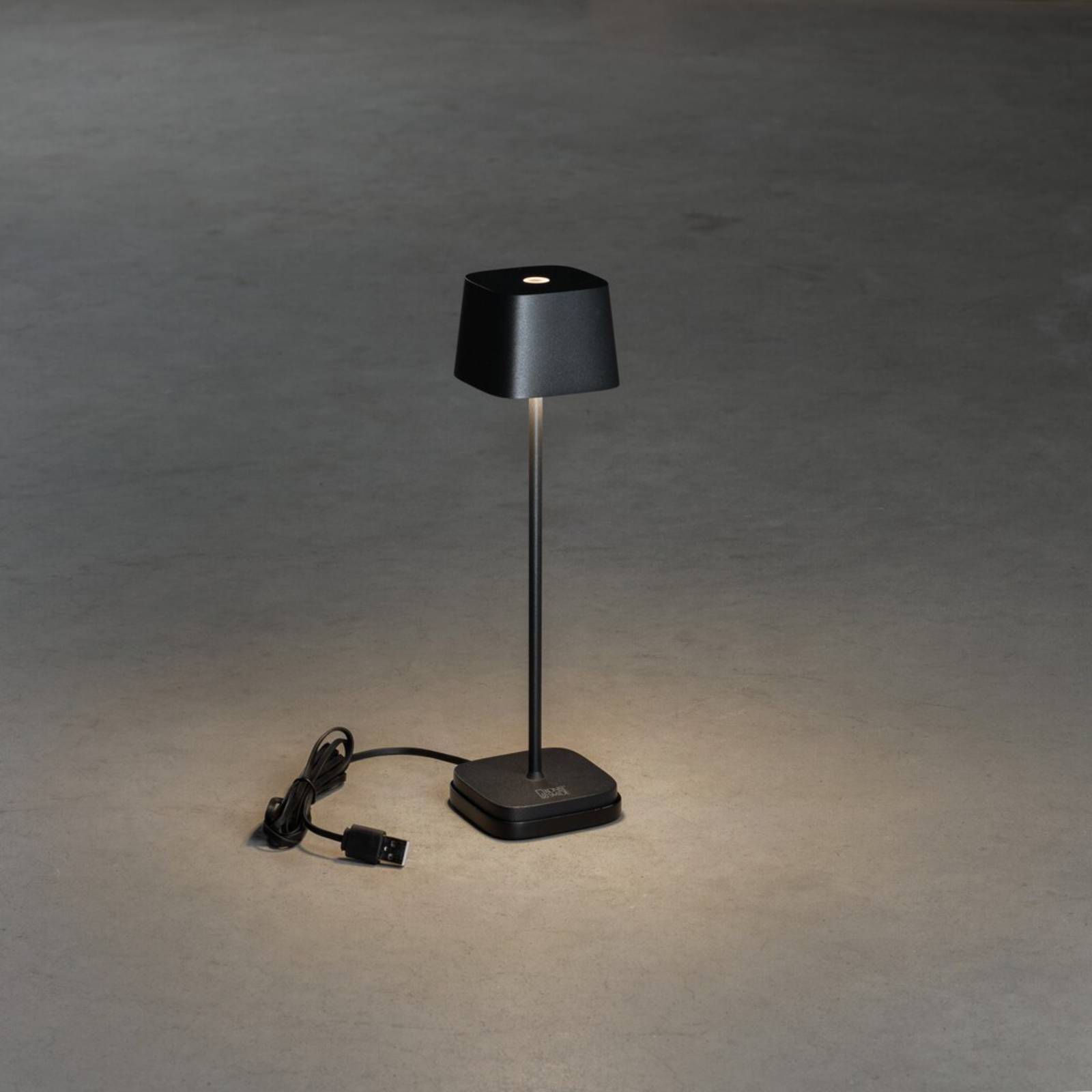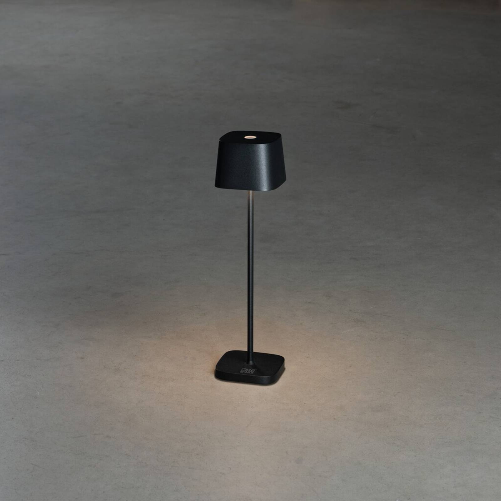 Kleine LED terraslamp Capri-Mini als tafellamp De LED tafellamp Capri-Mini is ontworpen voor sfeervolle accentverlichting in buitenruimtes. Ze is vervaardigd uit aluminium en bestaat uit een vierkante voet en een licht naar boven taps toelopende vierkante kap. De geïntegreerde LED’s schijnen naar beneden zodat een verblindingseffect wordt vermeden. Dankzij de oplaadbare accu is de Capri-Mini mobiel; een oplaadstation met USB-kabel voor het opladen in droge binnenruimtes wordt meegeleverd. Voor de bediening is de terrasarmatuur uitgerust met een aanraakschakelaar waarmee ook traploos van 100 tot 5 % kan worden gedimd en de kleurtemperatuur tussen 2.700 en 3.000 K kan worden gewijzigd.- incl. laadstation met USB-kabel- laadtijd: ca. 2,5 u- brandduur per lading: 9 u bij 100 %, 20 u bij 50 % lichtopbrengst