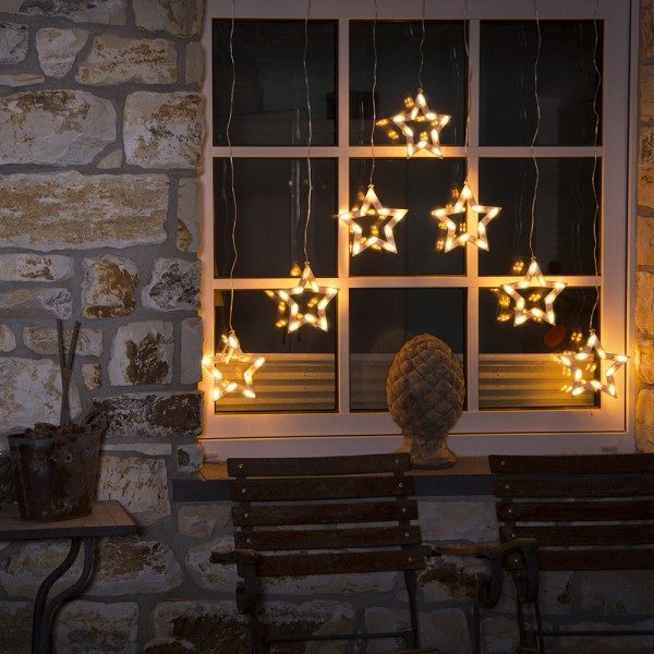 Deze intieme kerstverlichting is voorzien van 70 zonnig witte LED lampjes verdeeld over de 7 kerststerren. De kabel waar de sterren aan vast zitten is transparant, hierdoor valt deze bijna niet op en lijkt het alsof de lampjes voor het raam zweven. Als je de sterren wilt dimmen, kun je aangenaam een dimmer bijkopen en benuttigen. Let er op dat hoewel de sterren en het snoer zelf met IP44 waterdicht zijn, de transformator bij de voedingsbron met een IP-waarde van twintig droog moet liggen. Dat lukt gelukkig gemakkelijk met het lange snoer.
