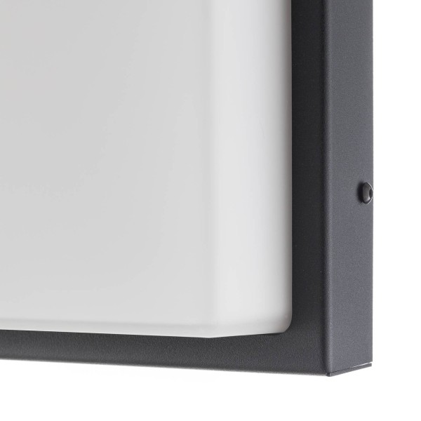 Ultra-moderne Babett LED buitenwandlamp met geïntegreerde bewegingssensor Die hoekige Babett LED buitenwandlamp heeft een hoogwaardig aluminium en roestvrij stalen frame en is uitgerust met een opaal glazen paneel dat is voorzien van energiezuinige LED verlichtingstechnologie en een geïntegreerde bewegingsmelder voor automatische lichtregeling. Over het geheel genomen zijn het ontwerp en de kleurstelling van het armatuur zeer Modieus en tijdloos, waardoor het armatuur een discrete blikvanger aan de huismuur is. Technische gegevens bewegingsmelder: – Verlichtingsduur instelbaar van 10 sec. tot 35 min. – Reikwijdte ca. 8 meter – Detectiehoek 180° – Schemerniveau instelbaar van 2-2000 lux