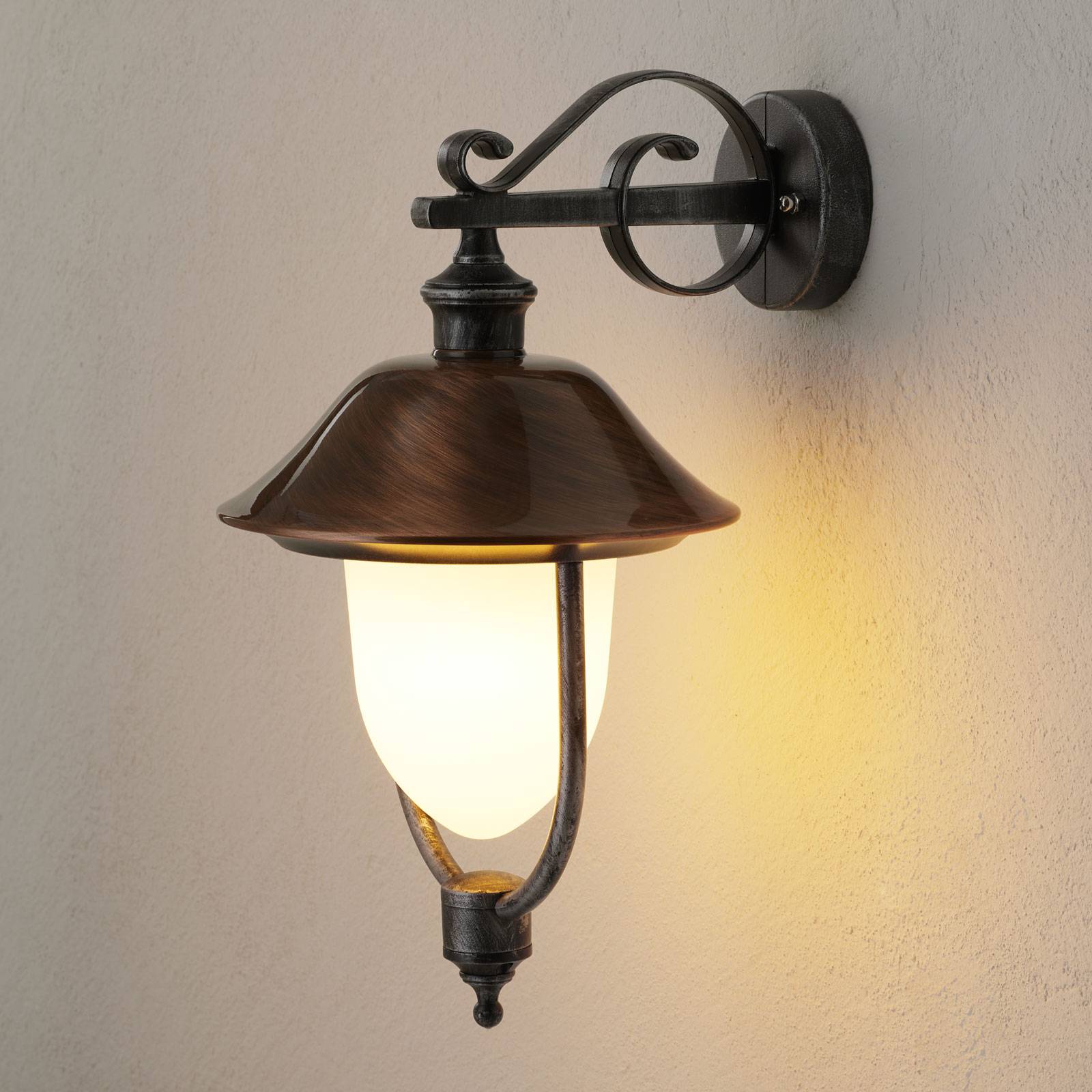 Geweldige buitenwandlamp Peggy in hangend design De klassiek vormgegeven buitenwandlamp Peggy maakt indruk met haar prachtige uiterlijk. De koperkleurige kap, die het licht net dat beetje extra geeft, is een bijzondere blikvanger. Peggy is gemaakt van glas en gegoten aluminium en is zeer robuust. Ze zorgt ook in het donker voor ideale lichtomstandigheden op het terrein. De effectieve buitenwandlamp is een verrijking voor elke buitenruimte. Energiebesparende en LED lampen zijn ook geschikt als lichtbronnen.