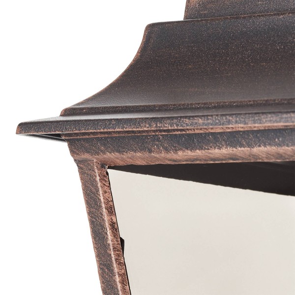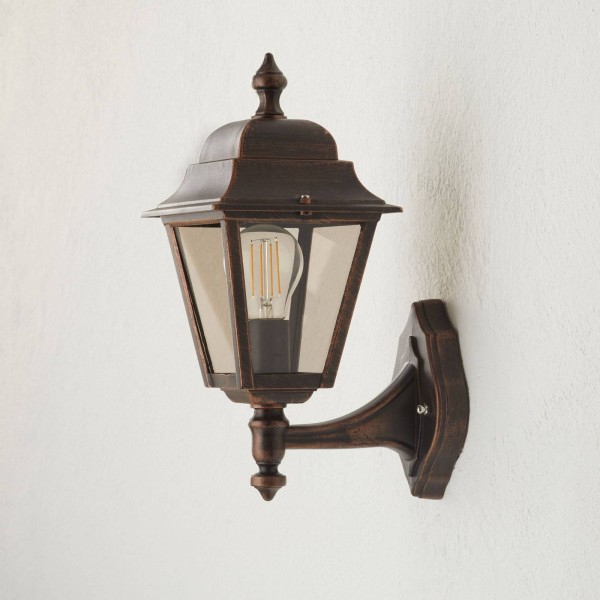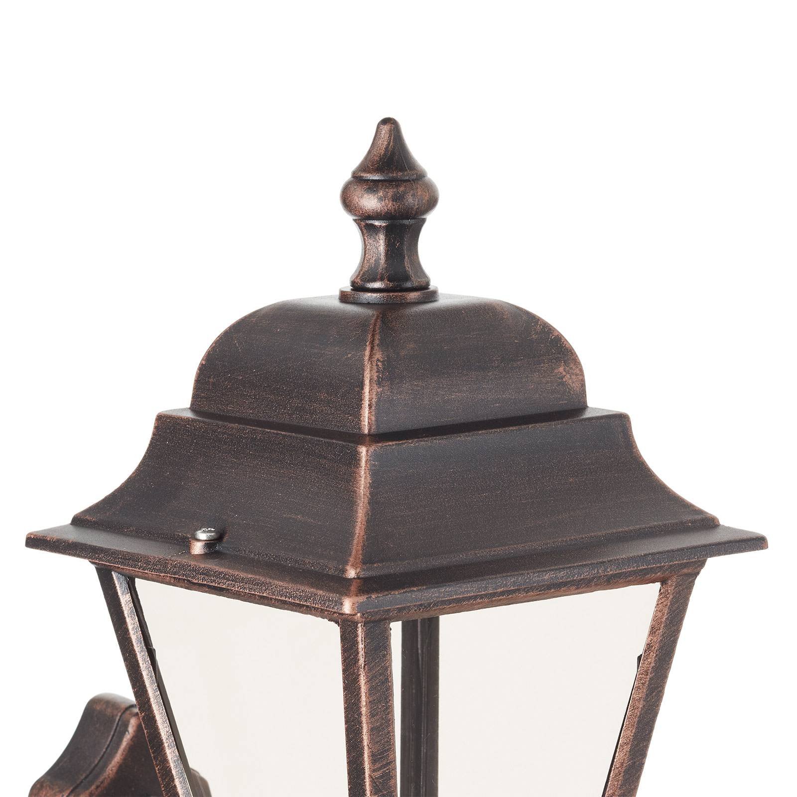 De koperen look geeft de buitenwandlamp Toulouse haar klassieke charme De buitenwandlamp Toulouse lijkt gemodelleerd naar de stijl van vervlogen tijden en geeft buitenruimtes een heel bijzondere sfeer. Het gestructureerde frame van gepoedercoat aluminium in een antieke koperen look maakt van de lamp ook een aantrekkelijke blikvanger. Met een beschermingsgraad van IP43 is Toulouse optimaal beschermd tegen het binnendringen van vreemde voorwerpen vanaf 2,5 mm en spatwater. Deze buitenwandlamp is ook compatibel met spaarlampen, wat haar nog aantrekkelijker maakt.