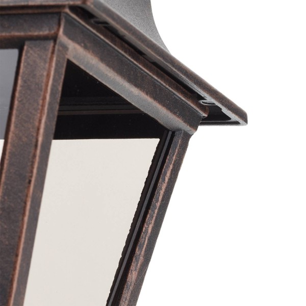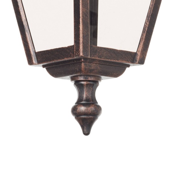 Klassieke buitenwandlamp Toulouse De buitenwandlamp Toulouse, die gemaakt is in de vorm van een antieke lantaarn van koperkleurig aluminium met poedercoating en licht getint glas en naar beneden hangt, ziet er bijzonder mooi uit op oude gebouwen of rustiek vormgegeven gebouwen. Het licht getinte maar heldere glas verlicht de omgeving helder en veilig.