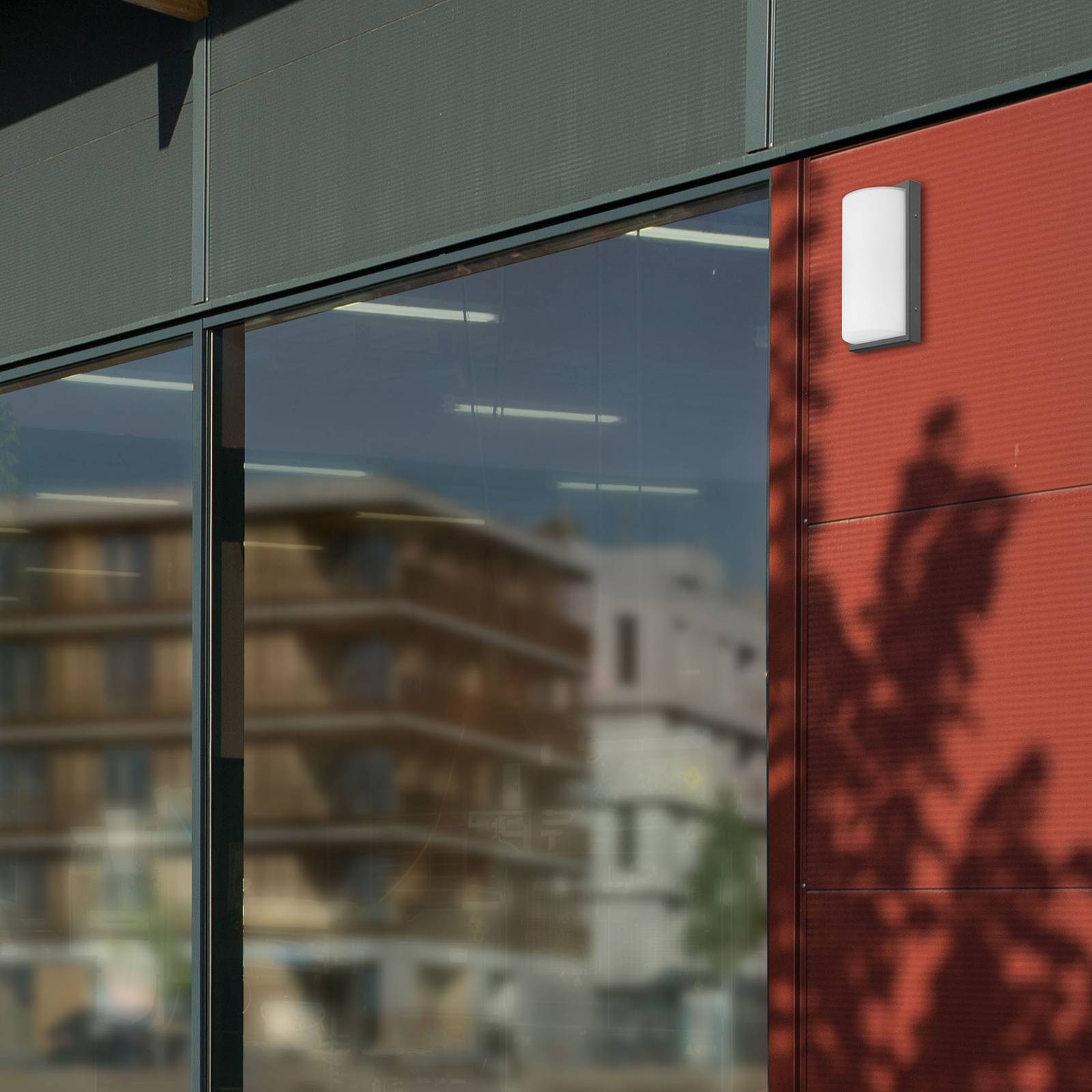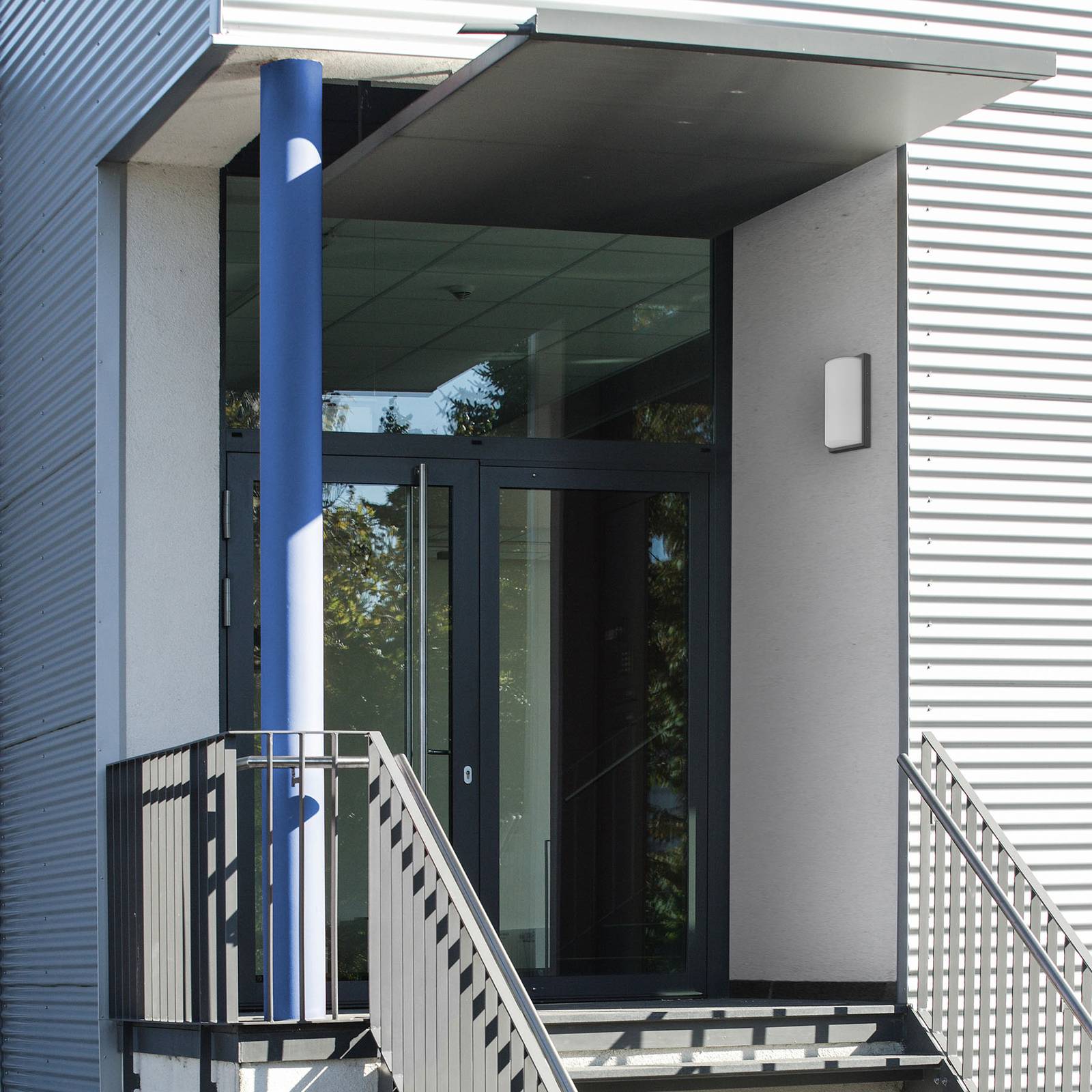 LED-buitenwandlamp 039 in rechthoekige vorm – uitgerust met bewegingsmelder Deze optisch onopvallende LED-buitenwandlamp heeft een opaalglazen afdekking die het warme witte licht van de geïntegreerde LED’s zonder schittering in de omgeving laat schijnen. Het slanke, grafietkleurige frame is gemaakt van roestvrij staal, de wandplaat van aluminium. Dankzij de geïntegreerde, instelbare bewegingssensor wordt het licht alleen geactiveerd als er mensen langskomen, waardoor 039 ideaal is voor entrees en loopbruggen langs de gevel. – Sensorbereik: tot 8 meter – Opsporingshoek: 180 – Ideale montagehoogte: 1,8 m tot 2,5 m – Tijdinstelling mogelijk van 10 seconden tot 12 minuten – Schemerdrempel instelbaar van 2 – 2.000 lux – Sensorschakelvermogen: max. 1.200 W