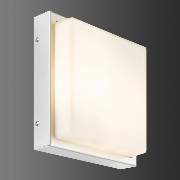 Deze eenvoudige, vierkante buitenwandlamp uit de 046-serie heeft een roestvrijstalen frame en een aluminium muurplaat. De opalen glazen diffuser straalt niet-verblindend warmwit licht uit in de omgeving.