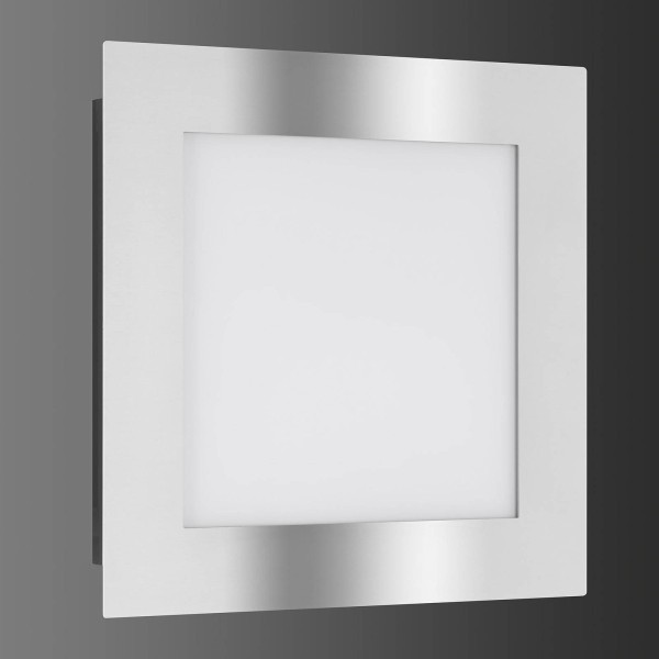 De vierkante buitenwandlamp 3006 heeft een frame van geborsteld roestvrij staal. Het warmwit licht wordt diffuus uitgestraald door de opalen glazen voorkant. De beugel, die alleen zichtbaar is vanaf de zijkanten, is afgewerkt in mat zwart.