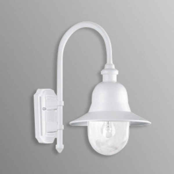 Witte buitenwandlamp Nios met gebogen arm Elk huis heeft geschikte gevelverlichting nodig in de buurt van de voordeur, zodat bijvoorbeeld het zoeken naar de sleutel van de voordeur niet eindeloos duurt. Bovendien betekent heldere sfeerverlichting extra veiligheid voor bewoners en gasten. Die Nios buitenwandlamp is volledig wit en kan dus gecombineerd worden met talloze muurkleuren en gevelstijlen. De grote diffuser van polycarbonaat zorgt voor voldoende lichtuitstraling rondom voor een sfeervolle ambiance van het pand. Met beschermingsgraad IP43 is ze beschermd tegen sterke weersinvloeden (spatwater).