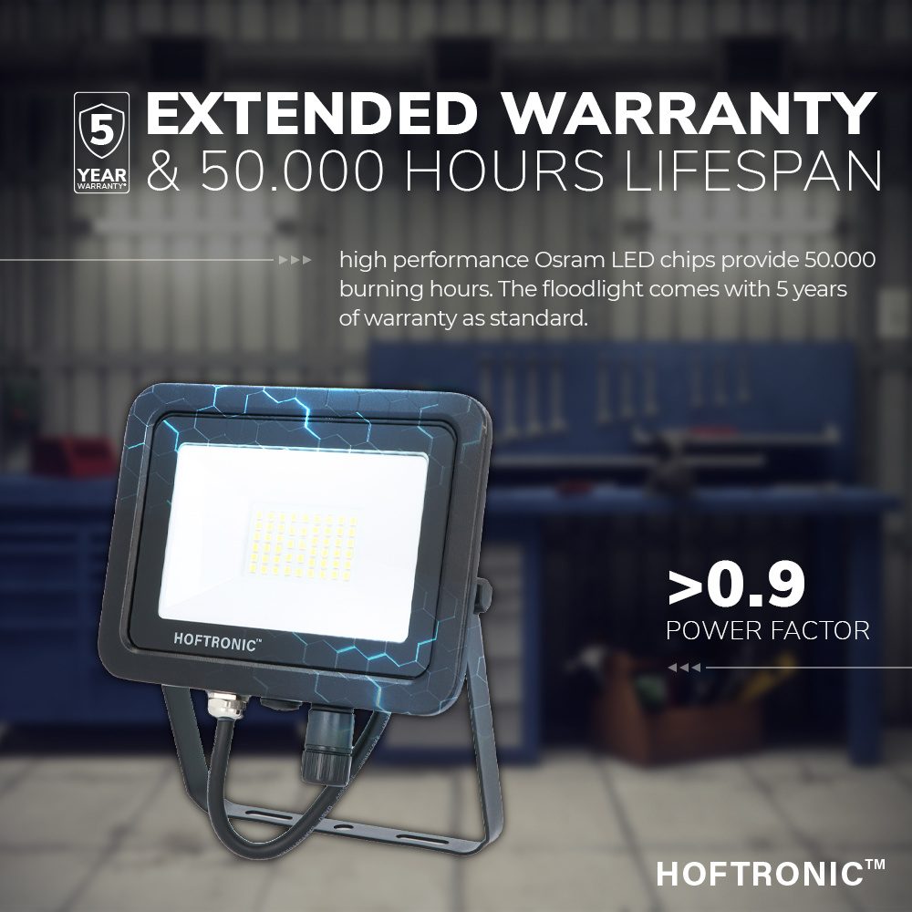 Begin onmiddelijk met het besparen van vitaliteit en vervang jouw huidige 270 Watt lamp door onze energiezuinige 30 Watt LED breedstraler van hoge klasse. Hoftronic™ LED breedstralers zijn uitgerust met de nieuwste Osram LED’s waarmee de kwaliteit van de breedstralers gewaarborgd wordt met een levensduur van 50.000 branduren en vijf jaar garantie. De aluminium behuizing zorgt voor een IP65-waarde waarmee de schijnwerper bekwaam is voor toepassingen in een binnen- en buitenomgeving. Ideaal voor het verlichten van etalages, showrooms, gebouwen, terreinen maar bovendien voor algemene buitenlamp. Door het neutraal witte licht van 4000K worden deze toepassingen uitmuntend verlicht.