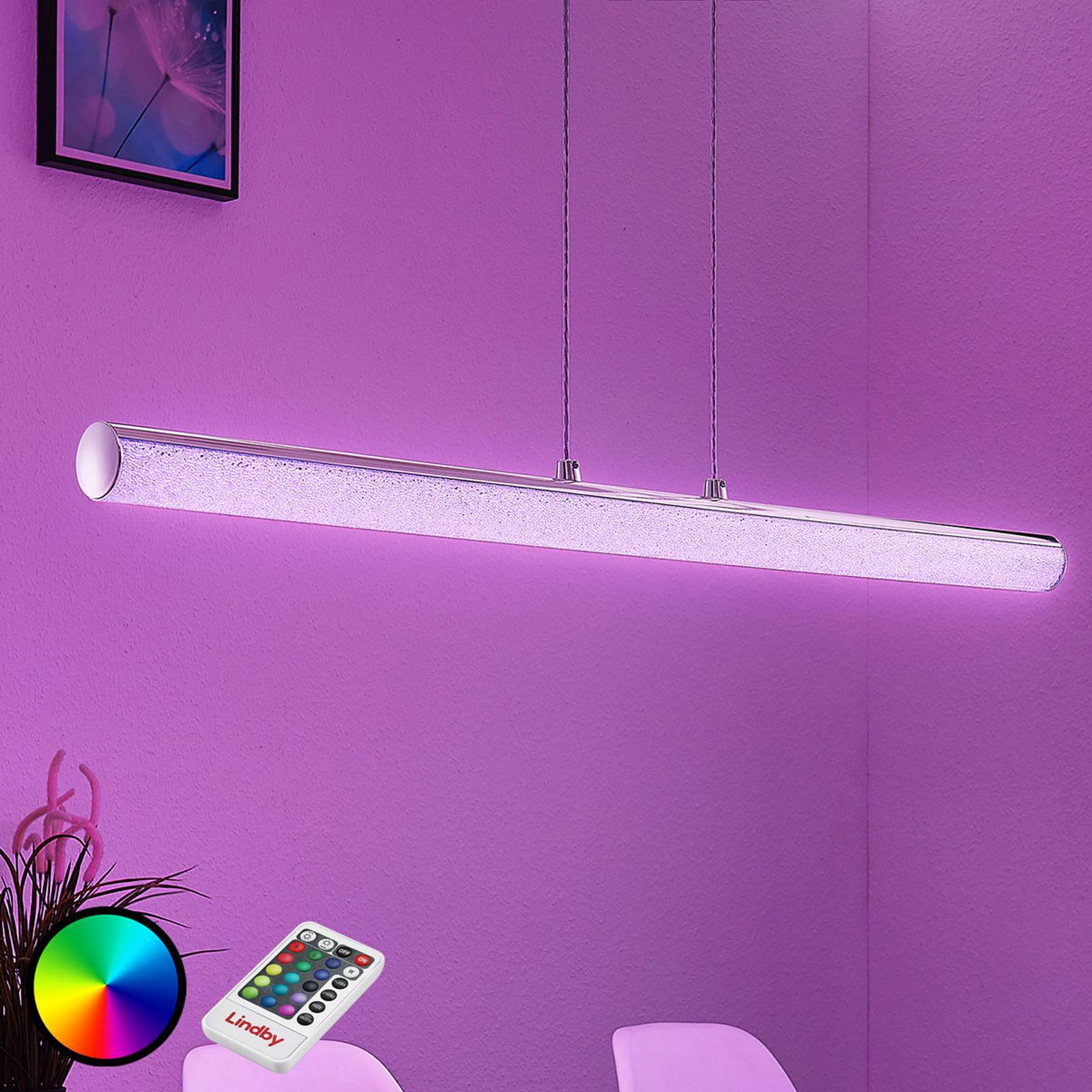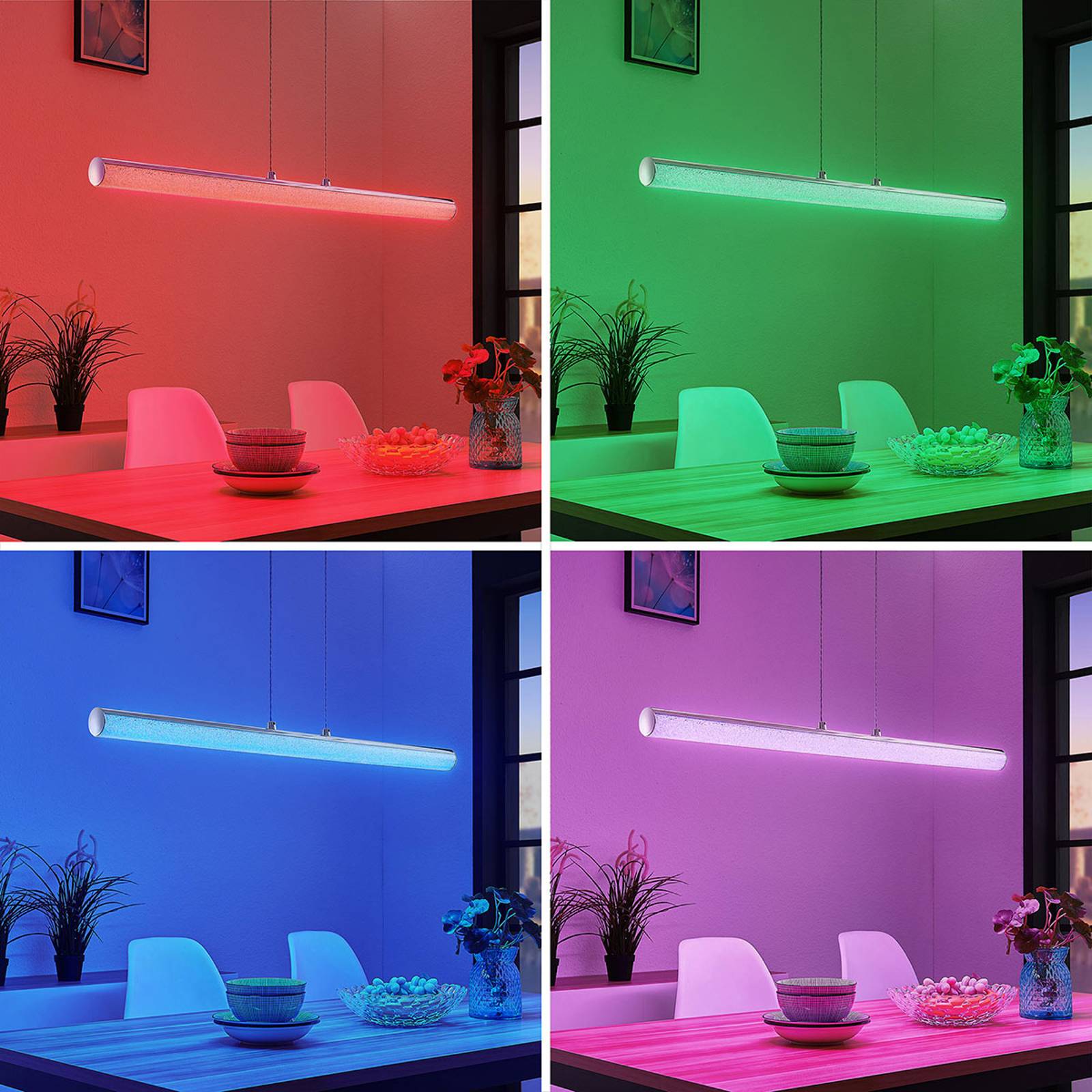 De hanglamp Fria is uitgerust met LED’s die zowel in warm wit als in kleurrijke RGB-kleuren kunnen schijnen. Met de meekomende afstandsbediening kan zowel de dimfunctie als de kleurverandering worden bediend. Het heeft ook een geheugenfunctie, zodat de laatst gekozen instelling bewaard blijft wanneer het toestel de volgende keer wordt aangezet.