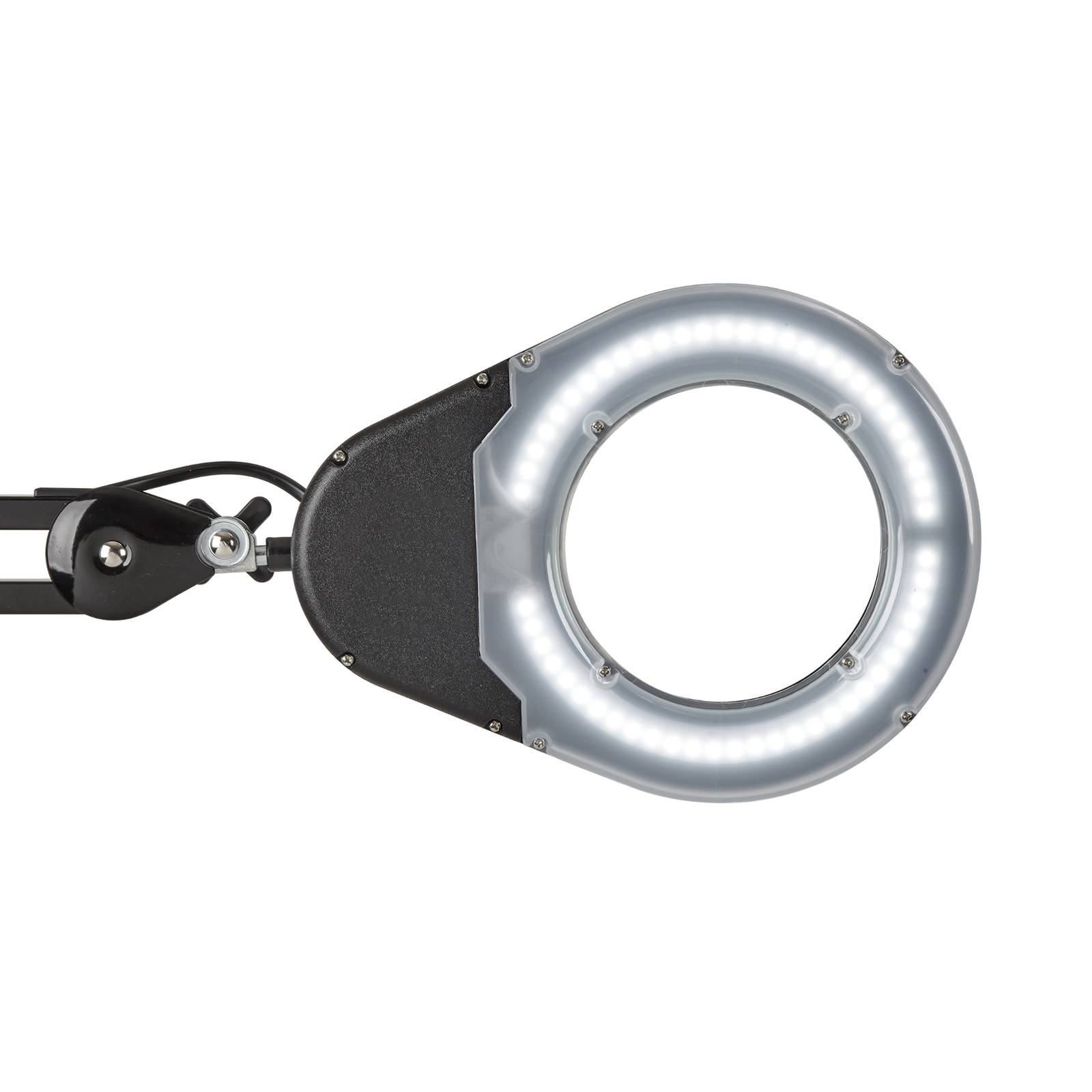 MAULviso – flexibele en stabiele LED loeplamp, zwart Variabel instelbaar, Solid en stabiel met een sterke parallellogram metalen arm, de MAULviso LED loeplamp is geschikt als lichtbron voor een breed scala aan gebieden. Die echt glazen lens met 3 dioptrie vergroot delicate voorwerpen met een factor 1,75, wat mechanisch precisiewerk gemakkelijk maakt. Het werkgebied wordt zonder schaduwen verlicht dankzij de 90 LED’s met de lichtkleur daglicht die in de ringvormige lampenkop zijn geïnstalleerd. Die is voorzien van een beschermkap tegen zonlicht en stof.