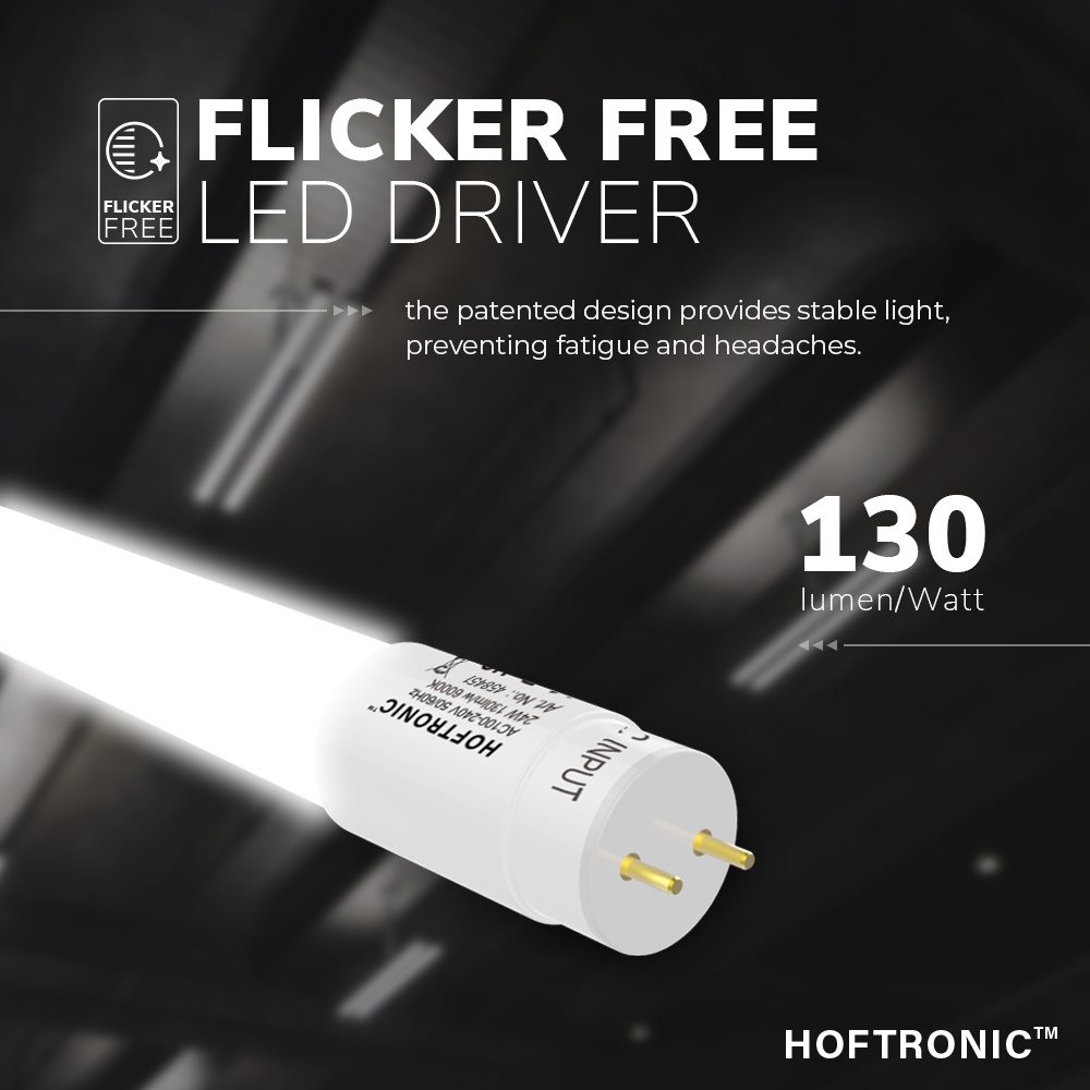 Volledig flikkervrij: Doordat de toegepaste LED TL buis vol flikkervrij is veroorzaakt het licht geen klachten als: vermoeidheid, hoofdpijn of concentratieproblemen. Dit maakt deze verlichting ook zeer bruikbaar voor kantoren, magazijnen en werkplaatsen.