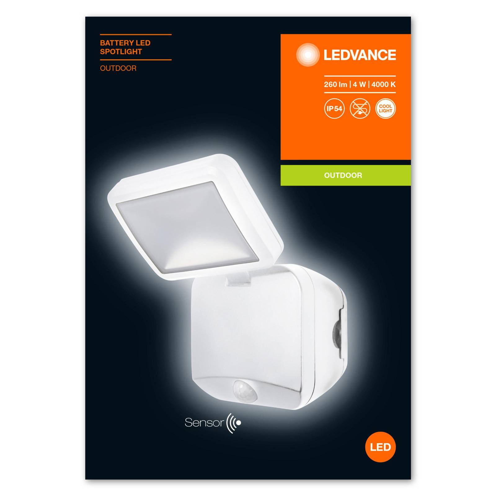 Uitlijnbare en op batterijen werkende buitenwandschijnwerper Batterij LED Spotlight Enkelvoudig in wit Deze buitenmuurarmatuur geeft licht wanneer dat nodig is – zelfs buiten de bedrading om. Vier D-batterijen worden gebruikt in Battery LED Spotlight Single. Om ervoor te zorgen dat hun energie niet na 5 uur uitgeput raakt, is het licht voorzien van een daglichtsensor en een bewegingsmelder. Deze laatste detecteert bewegingen op een afstand tot 7 meter, waarna de buitenmuurverlichting gedurende ongeveer 20 seconden wordt geactiveerd. Om bijvoorbeeld een pad dat naar het huis leidt optimaal onder een hoek te verlichten, kan de kop van de spot 180° worden gedraaid en 280° worden gedraaid. De witte ABS-kunststofbehuizing is bestand tegen de effecten van weer en wind. De nieuwe LEDVANCE producten, voorheen bekend onder de merknaam OSRAM, combineren de hoogste kwaliteitsnormen met een modern design.