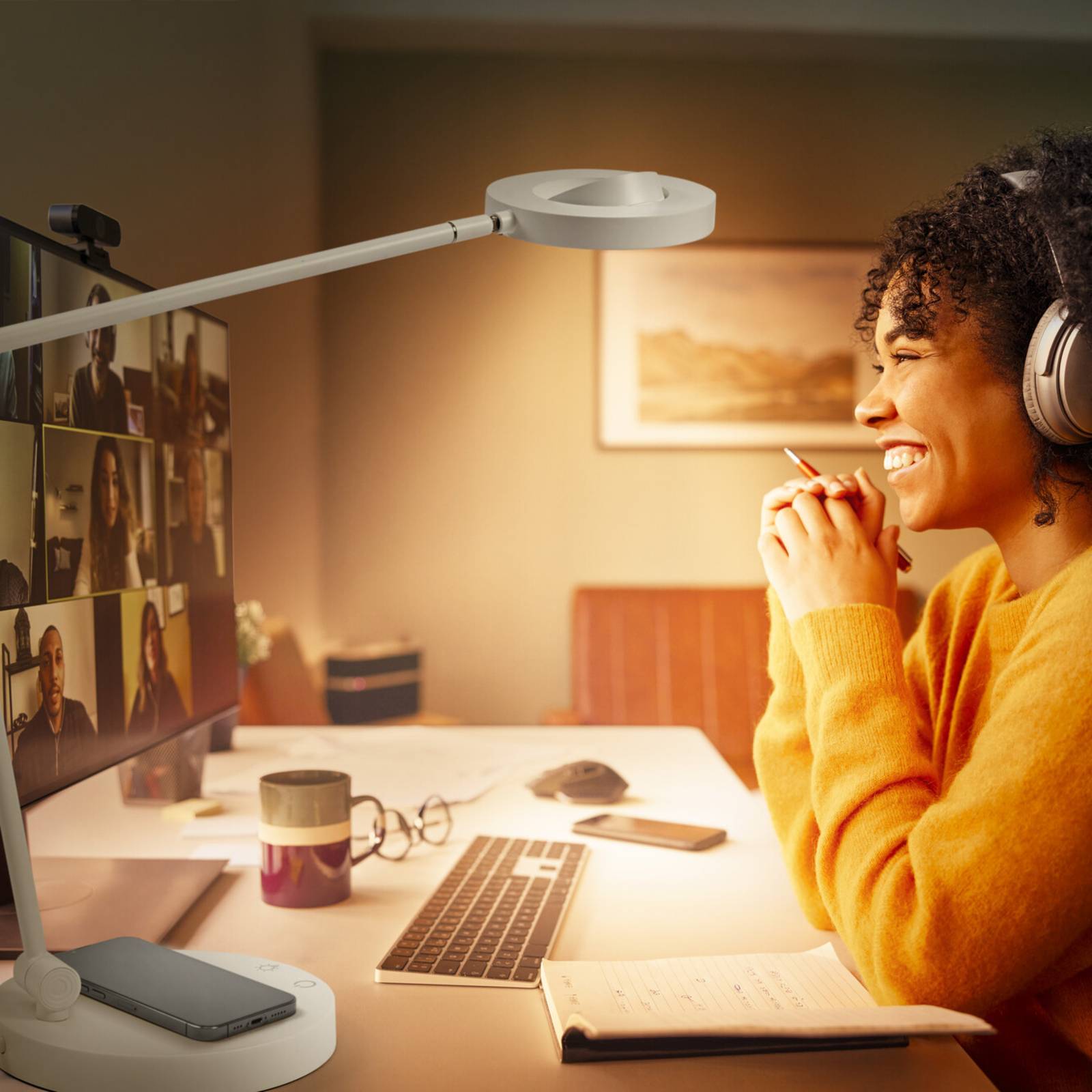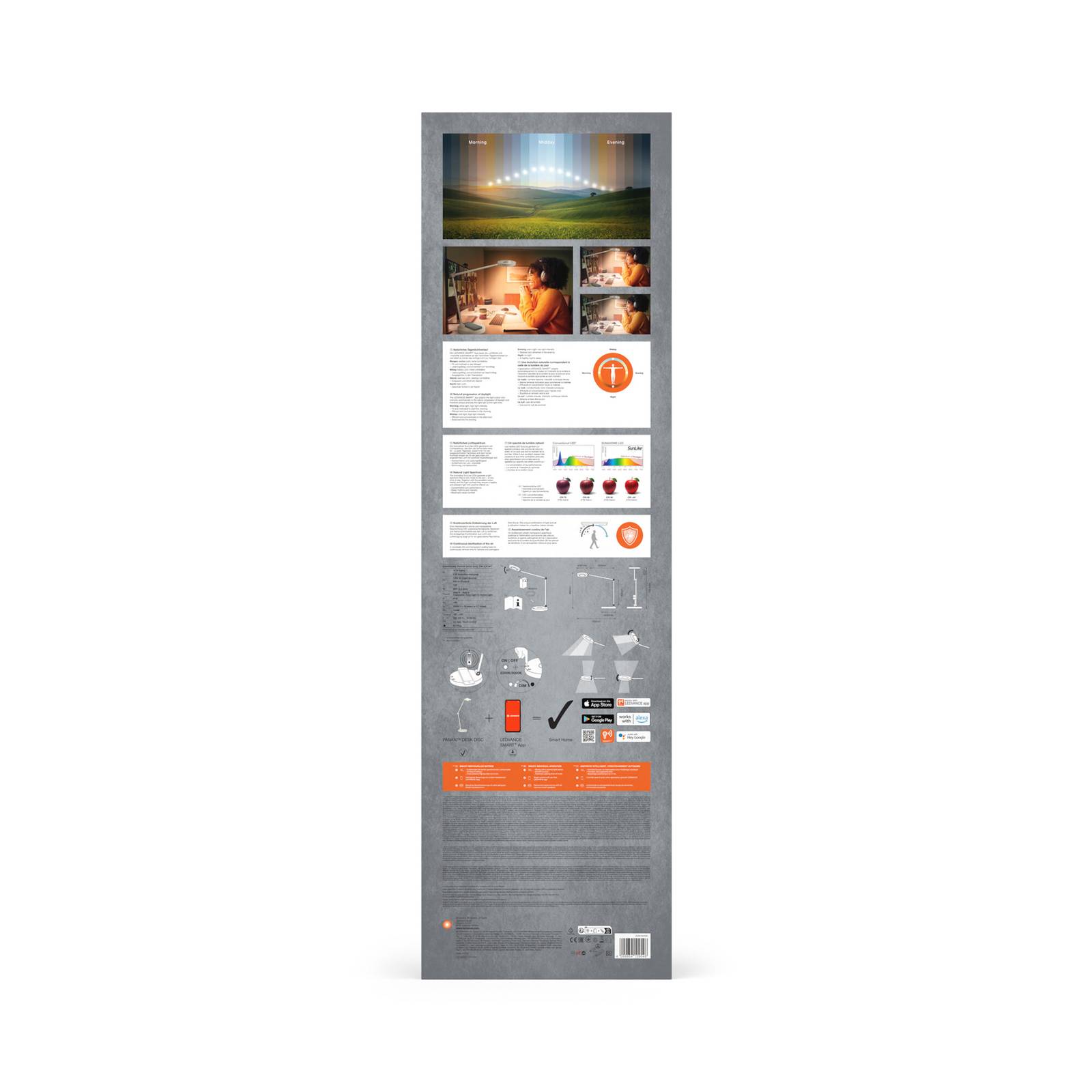 Flexibel instelbaar, te bedienen via Wi-Fi en met QI-oplaadstation in de voet: SUN@Home Panan Desk Disc LED bureaulamp, Ra95, CCT, HCL-technologie, dimbaar De SUN@Home Panan Desk Disc LED bureaulamp is een multitalent in de smart home sector. Zowel mechanisch als technisch zijn er talloze instelmogelijkheden. De armen kunnen naar wens worden uitgelijnd dankzij verschillende scharnieren, en het binnenste deel van de armatuurkop kan ook worden gedraaid voor een optimale uitlijning van de lichtkegel. Geïntegreerd in de voet is een QI-laadstation dat kan worden gebruikt om compatibele smartphones en andere elektronische apparaten inductief op te laden. Schakelaars voor handmatige bediening van de lichtfuncties zijn ook te vinden in de voet. Ze kunnen worden gebruikt om de kleurtemperatuur aan te passen (warm wit tot universeel wit) en de intensiteit van het licht kan ook traploos worden gedimd. Voor gemakkelijke bediening is de LEDVANCE SMART WiFi-app voor Android en iOS gratis beschikbaar. Via WLAN-verbinding kunnen alle functies worden bediend via smartphone of tablet, en bediening met spraakopdrachten is ook mogelijk met Amazon Alexa en Google Assistant (compatibel smart home-systeem vereist). Een ander hoogtepunt van deze smart home-bureaulamp is de zogenaamde Human Centric Lighting-technologie (HCL). Dit is een automatische regeling van de lichtinstellingen die is gericht op het natuurlijke bioritme of het typische verloop van de zon gedurende de dag. De SUN@Home serie dankt zijn naam aan zijn bijzonder goede kleurweergave (CRI 95). De innovatieve full-spectrum LED’s hebben een gereduceerd blauw lichtaandeel. Dit kan het welzijn verhogen en een positief effect hebben op de stemming en dus ook op de gezondheid. Bovendien hebben kleuren die met dit licht worden verlicht een bijzonder natuurlijk effect. Een coating tegen huishoudelijke ziektekiemen en geurtjes rondt dit smart home multitalent af. Technische kenmerken / compatibiliteit – bedienbaar via gratis LEDVANCE SMART WiFi-app; maakt voorinstellingen en automatiseringen mogelijk – stembesturing via Google Assistant of Amazon Alexa mogelijk (compatibel smart home-systeem vereist) – innovatieve SunLike LED’s met volledig spectrum en bijzonder goede kleurweergave (CRI 95) en verminderd gehalte aan blauw licht – bioritmefunctie (HCL) voor automatische regeling van de kleurtemperatuur – kleurtemperatuur handmatig instelbaar: 2.200 – 5.000 Kelvin – traploos dimbaar via app, stembesturing of handmatig via schakelaar – netwerkprotocol: WiFi bijzondere kenmerken – meervoudig instelbaar via scharnieren – draaibare binnenste kap om de lichtkegel uit te lijnen – maakt betere concentratie en efficiëntie mogelijk – kan het algemene activiteitsniveau en de alertheid overdag verbeteren, evenals het slaapritme en de slaapintensiteit – met coating tegen huishoudelijke ziektekiemen en geurtjes – incl. QI-oplaadstation in de basis voor het opladen van smartphones (inductief, draadloos opladen)