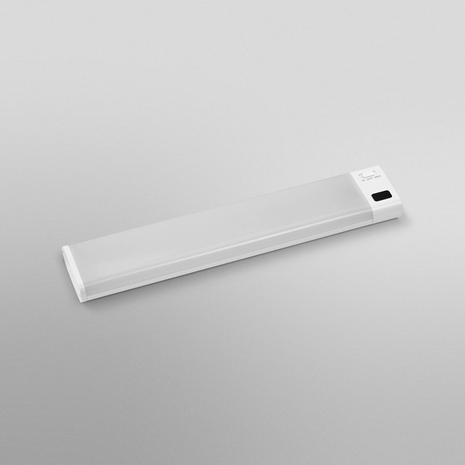Vlakke Linear Slim LED-onderkastarmatuur – helderheid en kleurtemperatuur instelbaar, gebarensturing, Wi-Fi-compatibelDe witte Linear Slim LED-onderkastarmatuur van polycarbonaat overtuigt met een functionele verlichting, vooral voor het werkvlak in het keukentje. De geïntegreerde gebarensensor maakt aanraakvrij schakelen mogelijk door de hand dichtbij te brengen. Als alternatief kan de WiFi-modus worden geactiveerd via een schuifregelaar op de behuizing. Na koppeling via WiFi kan er worden geschakeld, gedimd en de kleurtemperatuur worden geregeld via een app of spraakopdracht. Inclusief bevestigingsclips en aansluitkabel met plug-in voedingseenheid.Technische gegevens / compatibiliteit:- bedienbaar via LEDVANCE SMART WiFi-app (gratis verkrijgbaar voor iOS en Android); maakt voorinstellingen en automatiseringen mogelijk- spraakbesturing via Google Assistant of Amazon Alexa mogelijk- RGB en kleurtemperatuur instelbaar: 3.000 K – 6.500 K- dimbaar- netwerkprotocol: WiFi