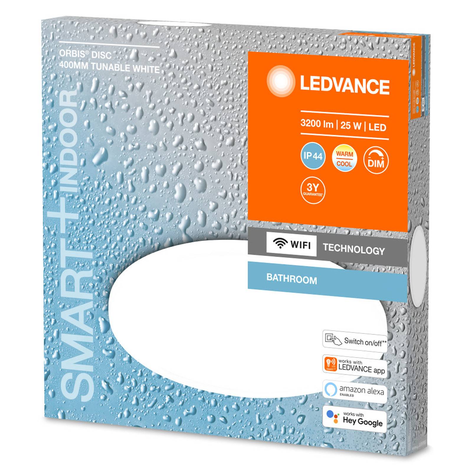 Discrete Orbis Disc LED plafondarmatuur met LEDVANCE SMART+ WiFi technologie De LED plafondarmatuur Orbis Disc overtuigt door haar tijdloze design en tegelijkertijd moderne functionaliteit. De armatuur heeft beschermingsgraad IP44 en is daarom ontwikkeld voor gebruik in badkamers. Hij is gemaakt van robuust aluminium en past dankzij zijn ronde vorm en witte kleur in tal van interieurstijlen. Het licht wordt verblindingsvrij uitgestraald, en de kleurtemperatuur en helderheid kunnen ook via een app of spraakbesturing worden geregeld. De plafondlamp is geïntegreerd met LEDVANCE SMART+ WiFi-technologie via WLAN. Technische gegevens / compatibiliteit: – Bedienbaar via LEDVANCE SMART+ WiFi app (met minstens Android 4.4 of iOS 9.0) gratis; maakt voorinstellingen en automatiseringen mogelijk. – Spraakbesturing via Google Assistant of Amazon Alexa mogelijk – Kleurtemperatuur instelbaar: 3.000 K – 6.500 K – dimbaar – Beschermingsklasse IP44 – Netwerk protocol: WiFi