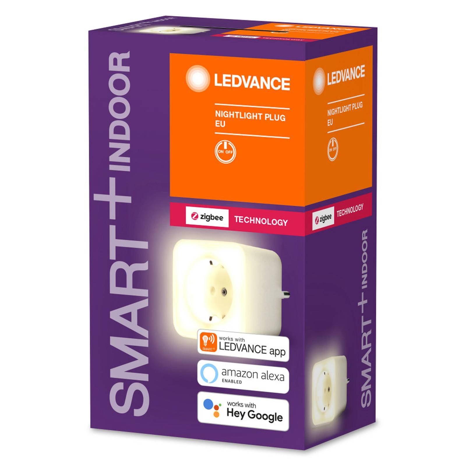 LED nachtlamp plug met warmwitte lichtkleur en LEDVANCE SMART+ ZigBee technologie Met de LED nachtlamp plug is het mogelijk om conventionele elektrische apparaten te integreren in compatibele SMART+ systemen en deze te bedienen via App of spraakbesturing. Das praktische nachtlampje biedt begeleiding waar het nodig is en is geschikt voor gebruik in bijvoorbeeld kinderkamers, gangen of slaapkamers. Technische gegevens/compatibiliteit: – Bediening via compatibel SMART+ systeem of aan/uit-knop op het apparaat – Bediening via App vereist een compatibel SMART+ systeem – Stembediening mogelijk met Google Assistant of Amazon Alexa, afhankelijk van het gebruikte SMART+ systeem – Schakelt op afstand bedienen van conventionele lichtbronnen en andere elektrische apparaten mogelijk – Geïntegreerd nachtlampje met warmwitte lichtkleur, niet dimbaar – Functiebereik is afhankelijk van het gebruikte type bediening – Hoog schakelvermogen: tot 3.680 W / 16 A – Netwerkprotocol: ZigBee