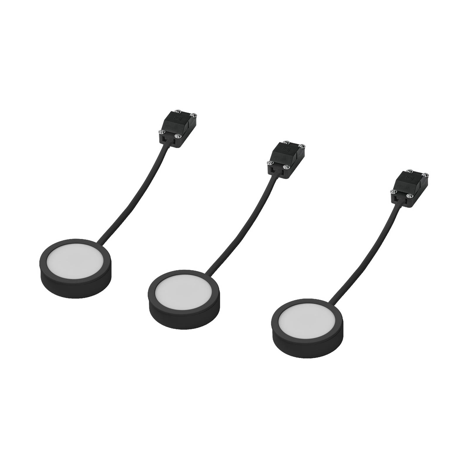 Set van drie Puck LED meubelspots, elk 3 W Met de Puck onderkastlamp kan bijvoorbeeld het werkblad in de keuken in een brede hoek in warm wit worden verlicht. De drie LED-spots van de set kunnen onafhankelijk van elkaar worden geplaatst en zijn elk voorzien van een korte aansluitkabel en een klem voor vaste bedrading op 230 V. De LED-drivers zijn geïntegreerd in de sporten. De LED-drivers zijn geïntegreerd in de sporten. Als alternatief is ook inbouwmontage mogelijk; dit vereist een opening van Ø 6 cm, een wanddikte van het meubel van 0,3 tot 2 cm en een spouwdiepte van > 3 cm.