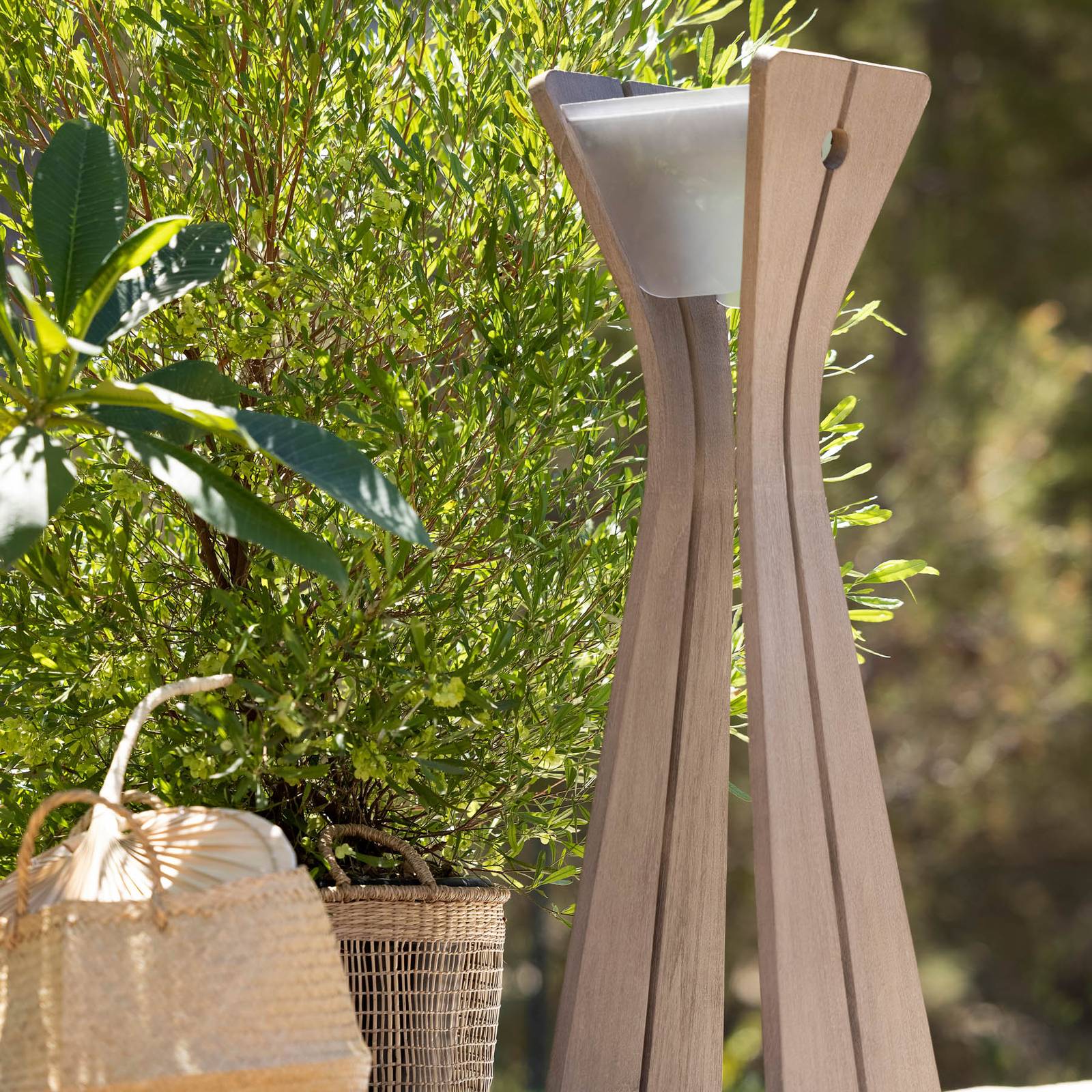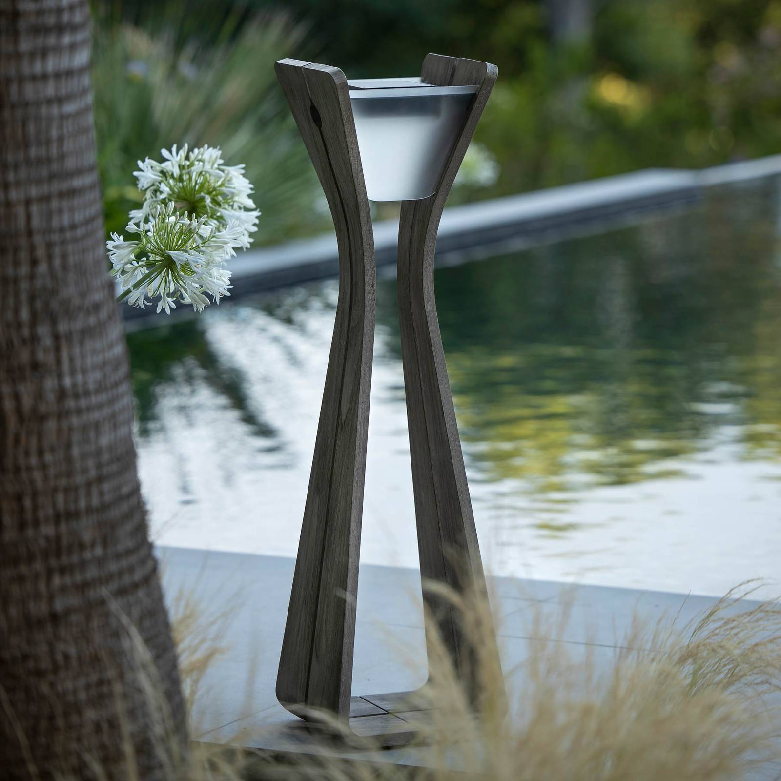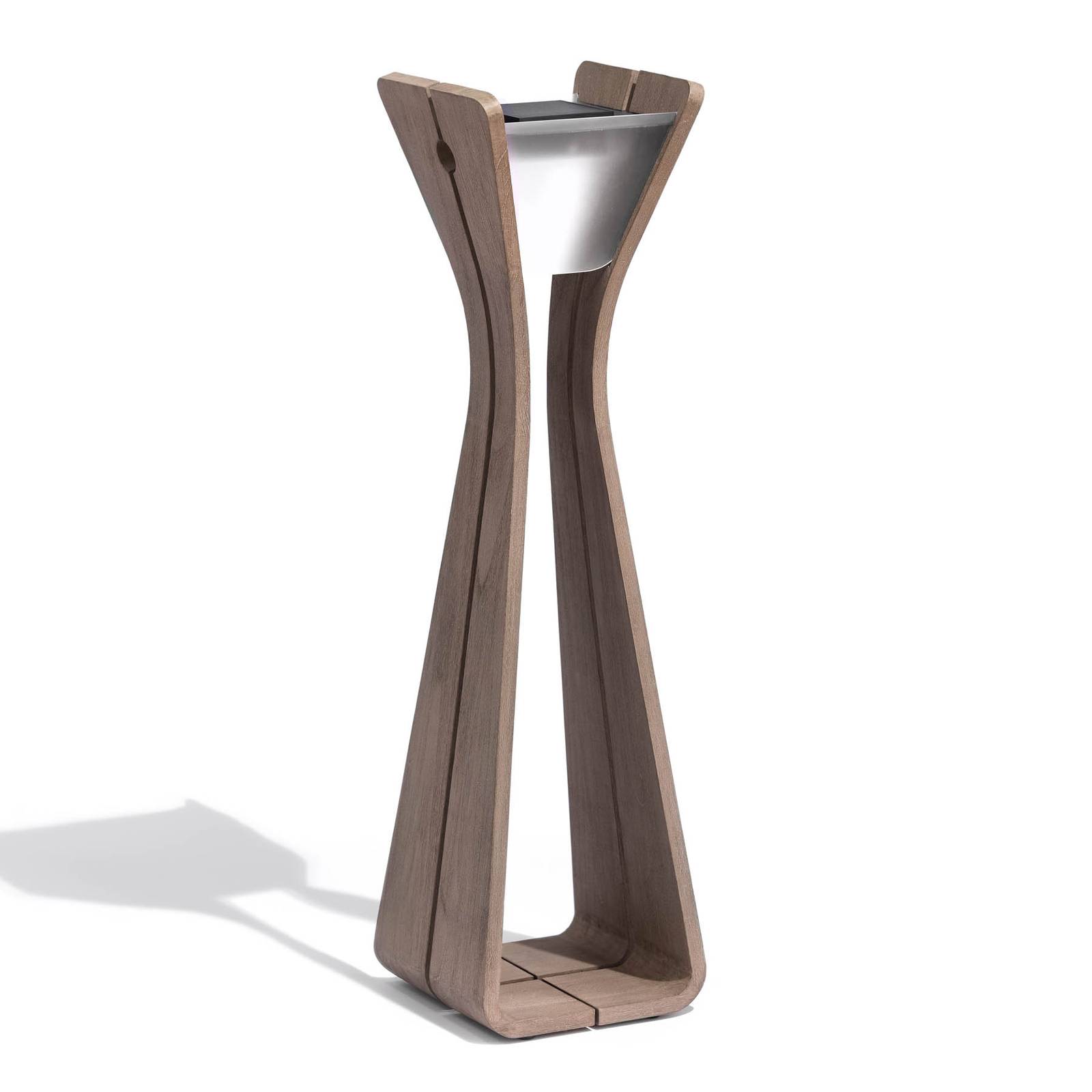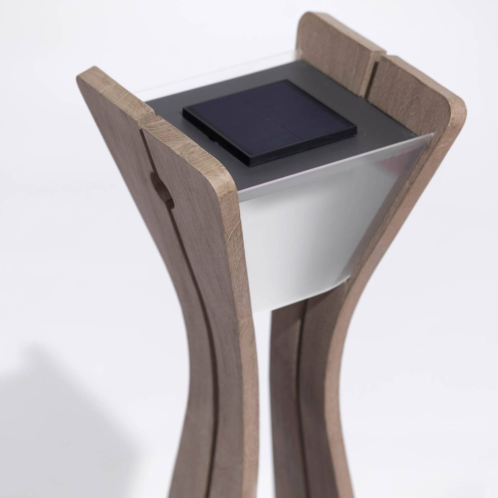 LED-zonnelamp Osmoz – modern gevormde terrasverlichting met zonnepaneel Zelfs als hij is uitgeschakeld, zal de LED-zonnelamp Osmoz u bekoren met haar gebogen design. Gemaakt van Duratek-materiaal van hoge kwaliteit, belooft hij duurzaamheid en een lange levensduur. Het is gemaakt van teakhout, dat zorgvuldig is bewerkt en voorzien van een waterdichte grondlaag. Extra lagen zorgen voor een optimale bescherming tegen de elementen. Het bovenste gedeelte bevat de lichtbron, die zich in een insert van melkglas bevindt en zijn licht rondom kan uitstralen. Dit maakt Osmoz bijzonder geschikt voor het verlichten van wandelpaden en terrassen en dankzij de zonnemodule kan hij volledig onafhankelijk van het elektriciteitsnet worden gebruikt. Drie verschillende modi kunnen worden geselecteerd en ingesteld: – 1e modus: de parameters stroomverbruik, energiereserve en donkertijd worden gecontroleerd, waarop de helderheid van de LED’s wordt afgestemd om de hele nacht te blijven branden. – 2e modus: Bewegingssensor wordt ingeschakeld en gaat bij schemering automatisch branden zodra hij beweging detecteert. – 3e modus: het licht brandt permanent en kan tot 5 uur branden als het volledig is opgeladen. De lichtintensiteit kan individueel worden aangepast, waardoor de brandduur tot 200 uur kan worden verlengd. De bewegingssensor staat uit. – Sensorbereik: 6 m, detectiebereik: 120°. Niet oliën, alleen reinigen met zeepwater.