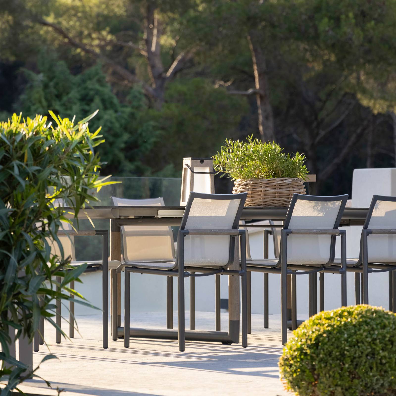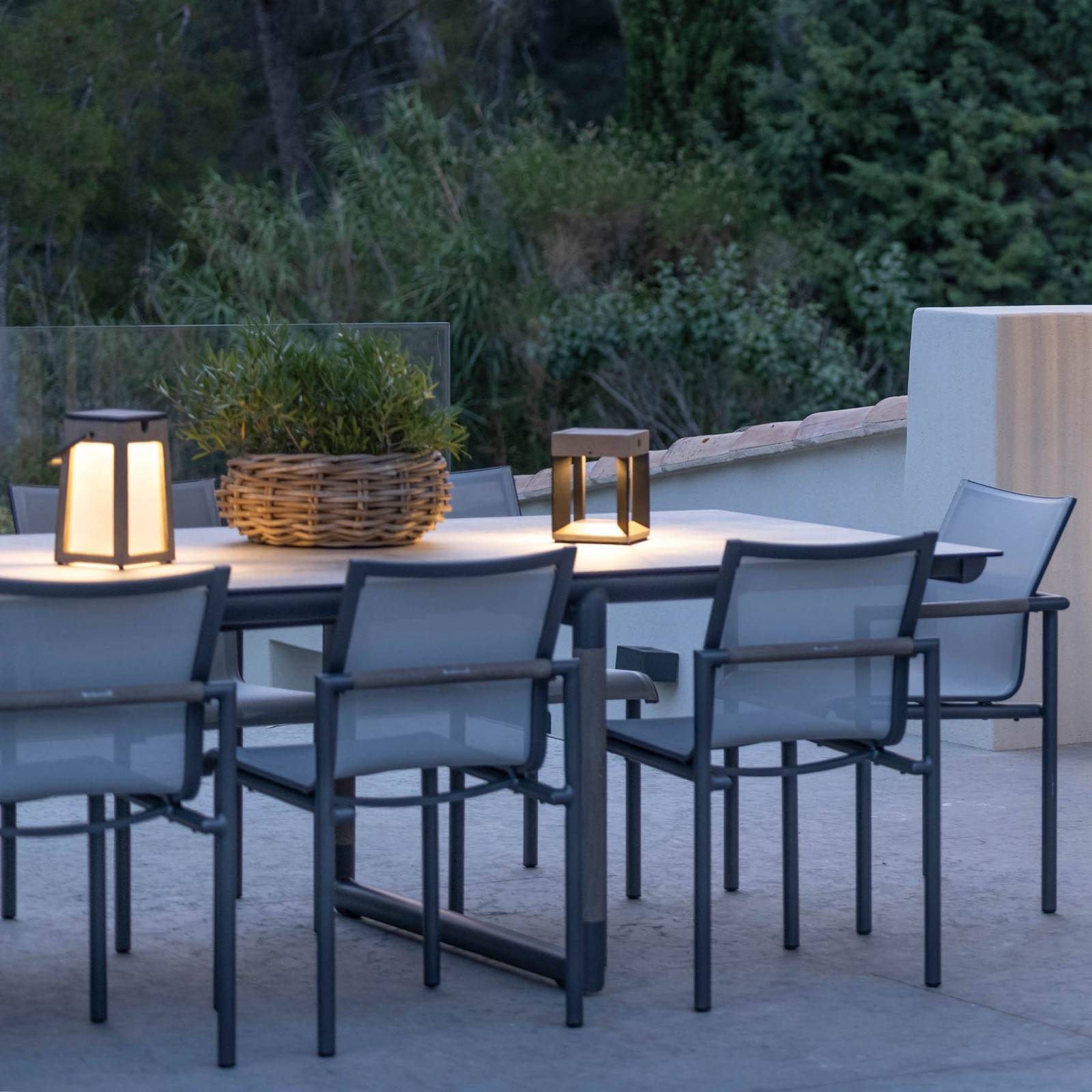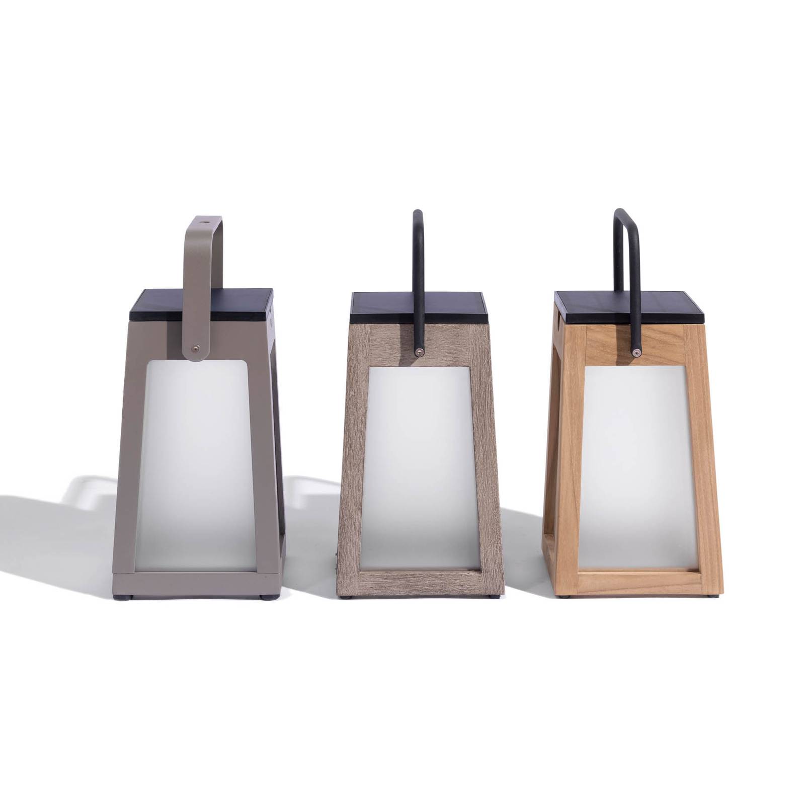 Modern vormgegeven LED-zonnelantaarn Tecka met draaggreep van aluminium Individueel of gegroepeerd in meerdere, geplaatst op de tafel of op de vloer of bijvoorbeeld opgehangen in de bomen bij een tuinfeest – Tecka zorgt voor netonafhankelijke verlichting op elke locatie dankzij de werking op zonne-energie, die met zijn zachte lichtsfeer bijdraagt aan een bijzondere sfeer. Wanneer hij volledig door de zon is opgeladen, geeft hij tot 150 uur licht totdat hij opnieuw moet worden opgeladen. De lichtsterkte kan naar wens worden aangepast via de geïntegreerde dimmer. Het teakhout is uiterst onderhoudsvriendelijk. Het werd eerst krachtig geborsteld om een getextureerde afwerking te verkrijgen. Na een eerste laag waterdichte primer werden vervolgens vijf lagen grijze lak aangebracht. Dit proces beschermt het hout tegen verwering, UV-stralen en verschillende vlekken zoals wijn, koffie of olie. De grijze kleur benadrukt de hedendaagse chic. Onderhoud: Niet oliën. Schoonmaken met zeepwater. De praktische draagbeugel is van aluminium. – Beschermingsklasse IP55 (stof- en straalbestendig)
