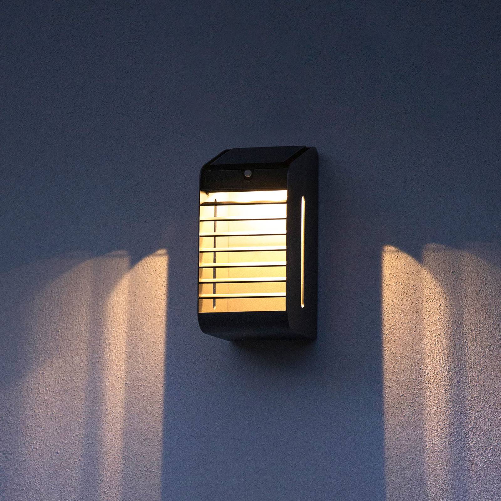 Hoek-LED-buitenwandlamp met zonnepaneel, dimbaar Dankzij een moderne zonnemodule heeft deze buitenwandlamp geen directe stroomaansluiting nodig. Hij kan ook worden opgeladen via een USB-kabel. De hoek is gemaakt van aluminium en heeft aan elke kant een gleuf, terwijl aan de voorkant een waaiervormige optiek is aangebracht, door de openingen waarvan het warme witte licht naar buiten stroomt en de buitenruimte zacht verlicht. De module heeft drie instelbare modi: – 1e modus: de parameters stroomverbruik, energiereserve en donkertijd worden gecontroleerd, waarop de helderheid van de LED’s wordt afgestemd om de hele nacht te blijven branden. – 2e modus: Bewegingssensor wordt ingeschakeld en gaat bij schemering automatisch branden zodra hij beweging detecteert. – 3e modus: het licht brandt permanent en kan tot 5 uur branden als het volledig is opgeladen. De lichtintensiteit kan individueel worden aangepast, waardoor de brandduur tot 200 uur kan worden verlengd. De bewegingssensor staat uit. – Sensorbereik: 6 m, detectiebereik: 120°.