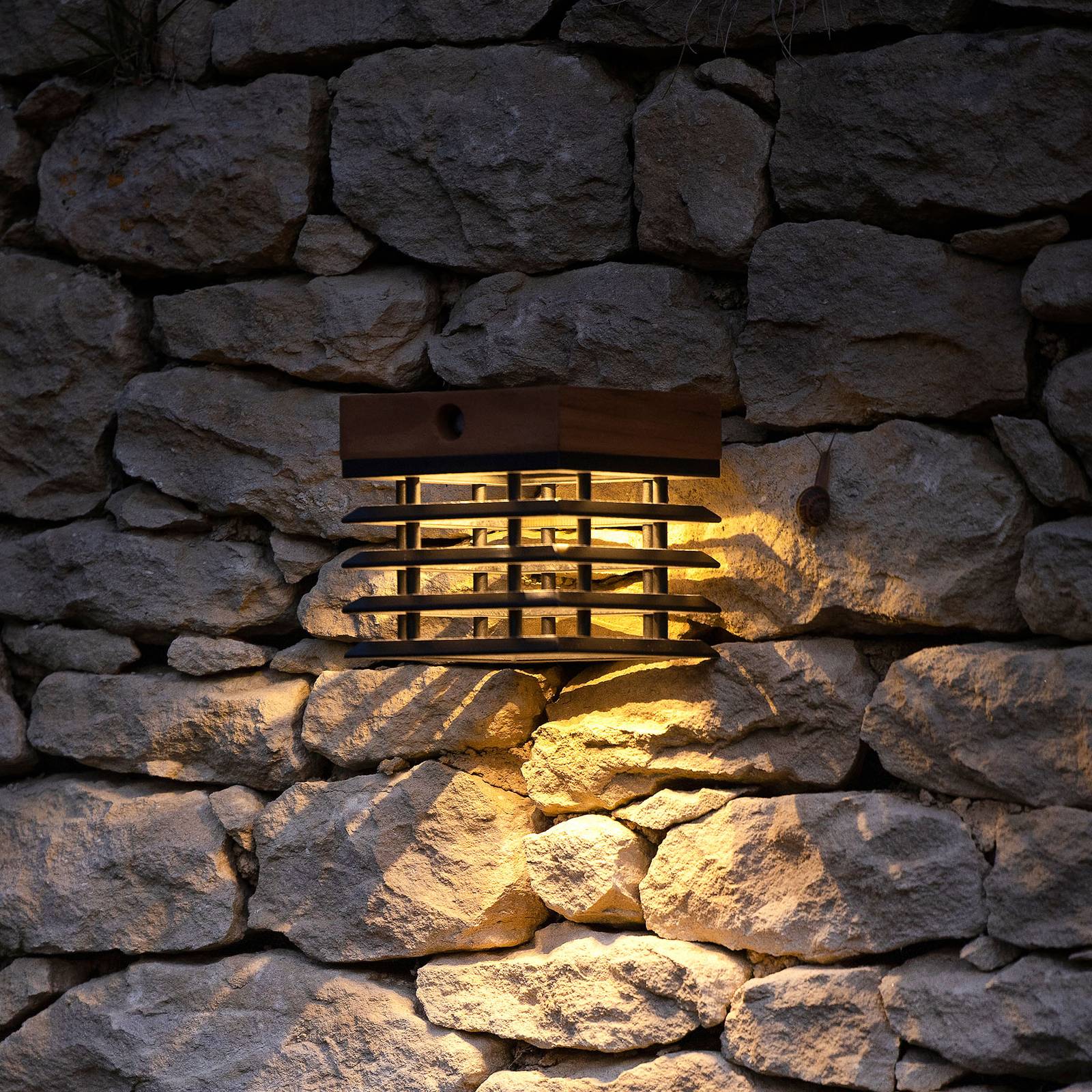 Dimbare LED-buitenwandlamp Tekura met zonne-energie De Tekura LED wandlamp op zonne-energie is gemaakt van hoogwaardig, robuust teakhout en overtuigt met een natuurlijke uitstraling die wordt aangevuld door leisteengrijs. Het open ontwerp creëert een sfeervol en aantrekkelijk licht dat patronen op de muur tovert en de buitenruimte net dat ietsje meer geeft. Op het zonnepaneel kunnen twee standen worden ingesteld: In de eerste modus controleert het systeem voortdurend drie parameters: stroomverbruik, energiereserve en donkere tijd. De lichtsterkte van de armatuur wordt dan dienovereenkomstig aangepast, zodat het licht de hele nacht kan branden. Zowel bij het begin van de duisternis als aan het einde van de nacht is er meer licht. In de tweede stand blijft het licht permanent aan bij volle lichtsterkte. Door de Aan/Uit knop lang in te drukken, kan de lichtintensiteit individueel worden ingesteld. – alternatief ook oplaadbaar via USB kabel – Lichtduur tussen 4-150 uur