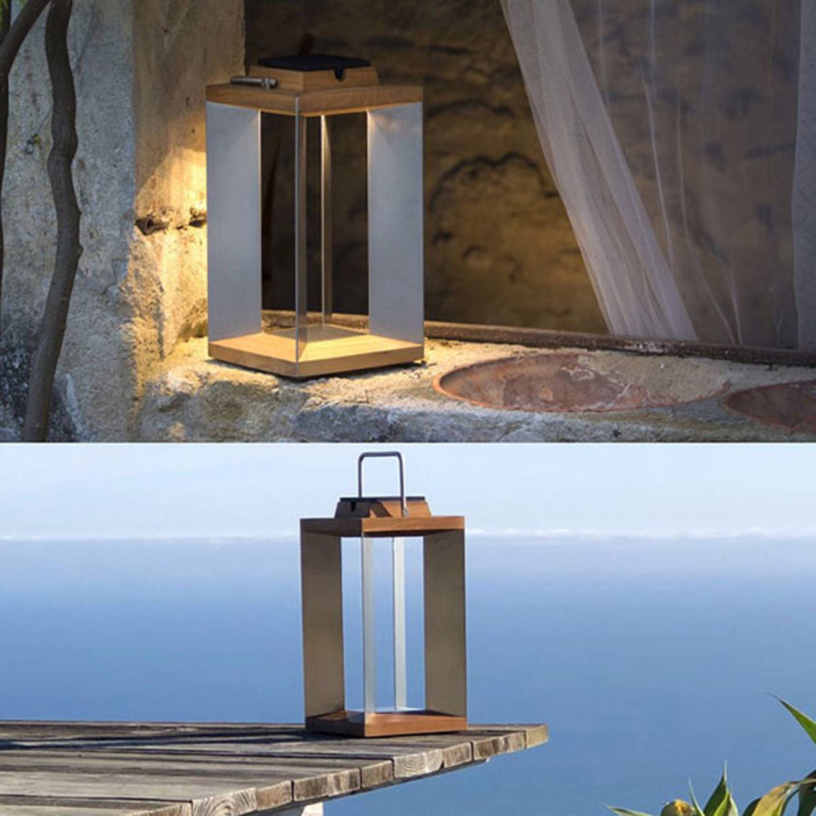 LED-zonnelantaarn Teckinox: oplaadbaar via zonnepaneel of via USB-kabel De LED-zonnelantaarn Teckinox presenteert zich in een modern design met natuurlijke flair: hij is gemaakt van roestvrij staal en natuurlijk teakhout en ziet er door zijn lineaire vorm tijdloos chique uit. Energiebesparend en gratis kan hij via het geïntegreerde zonnepaneel worden opgeladen wanneer er voldoende zon is. In het koelere seizoen, wanneer de zon minder vaak schijnt, kan hij via een USB-kabel en het lichtnet worden opgeladen. De mobiele lantaarnlamp is geschikt voor vele verlichtingssituaties: bijvoorbeeld op het terras, op de toegangstrap, naast de voordeur of op de balkontafel. – Geïntegreerde bewegingssensor – dimbaar – Lichtduur: 5-200 uur