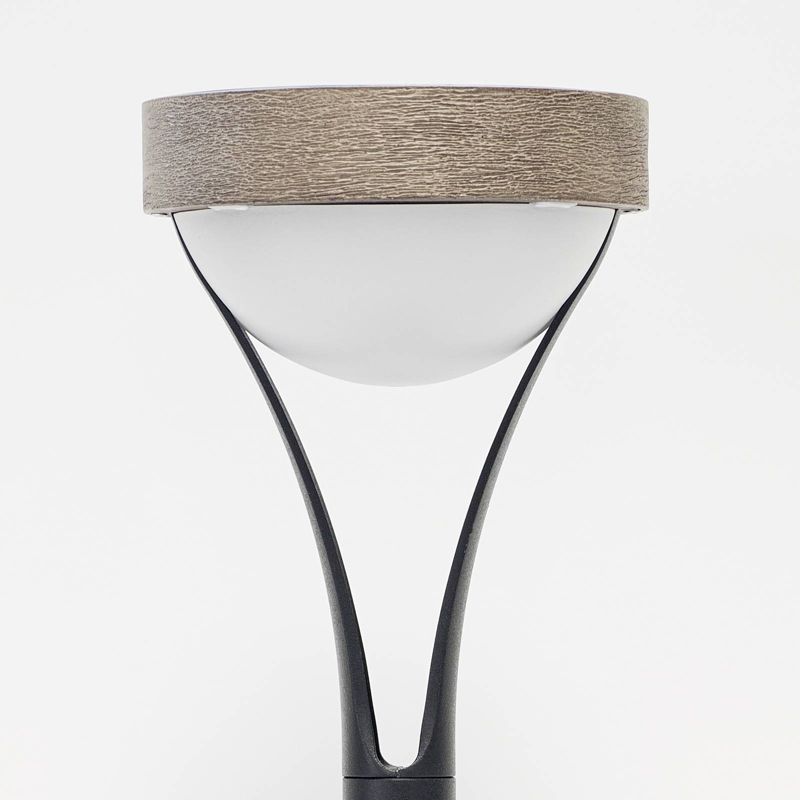 Warmwitte LED tafellamp Tyble op zonne-energie met IP66 De Tyble tafellamp op zonne-energie is uitgerust met een innovatieve zonnemodule bovenop de kap waarmee je twee verschillende standen kunt instellen. De lamp heeft ook een zeer elegant ontwerp, dat wordt bepaald door de materiaalcombinatie van robuust aluminium en duurzaam teakhout. Het teakhout is zeer gemakkelijk schoon te maken. Het werd eerst krachtig geborsteld om een getextureerde afwerking te krijgen. Na een eerste laag waterbestendige grondverf werden vijf lagen grijze lak aangebracht. Dit proces beschermt het hout tegen weersinvloeden, UV-stralen en verschillende vlekken. Mode 1 is de intelligente modus die automatisch de helderheid aanpast. Wanneer de module bij het vallen van de avond automatisch wordt ingeschakeld, weet hij hoeveel energie hij heeft en hoeveel uren licht hij moet geven. Hij past zijn intensiteit aan zodat hij de hele nacht actief blijft. Bij zonsopgang schakelt hij automatisch uit. De module optimaliseert automatisch de helderheid op basis van de energiereserve, de locatie en het klimaat. Hij controleert voortdurend het stroomverbruik, de energiereserve en de donkere tijd. In modus 2 kan de helderheid handmatig worden ingesteld van 3 tot 200 lumen. De module wordt ingeschakeld bij een vooraf ingestelde lichtsterkte van 200 lumen, met een lichtduur van 8 uur. Als de module in deze modus uitschakelt omdat de batterijen leeg zijn, schakelt hij automatisch over naar modus 1. – Lichtduur 8 uur bij 200 lumen, 16 uur bij 100 lumen, 31 uur bij 50 lumen – Opladen via zonne-energie: 9 uur onder optimale omstandigheden – Opladen via USB: 5 uur – Inclusief een lithium-ionaccu van 2,6 Ah