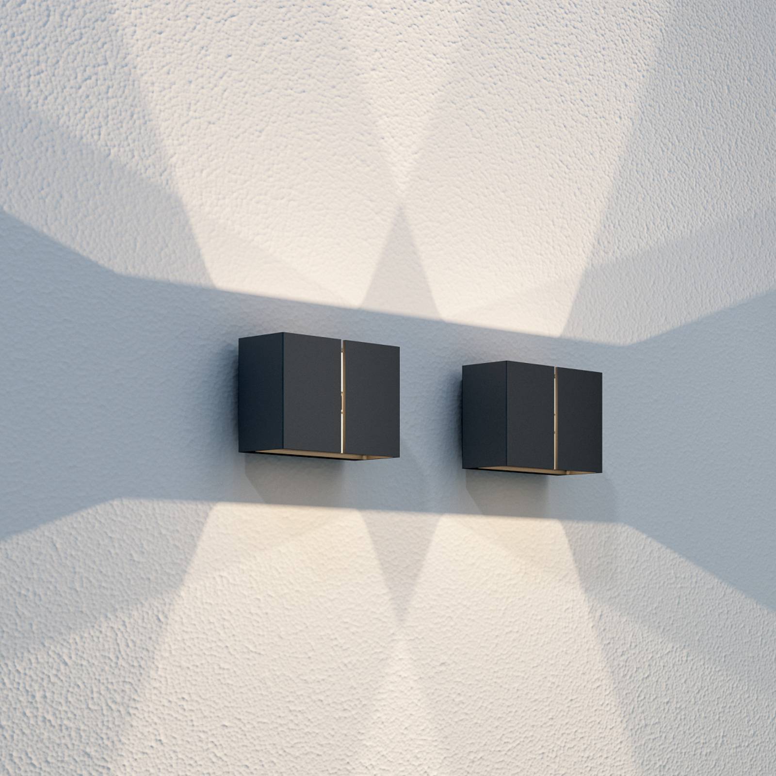 Hoekige LED buitenwandlamp Ask met naar boven en beneden gericht licht De behuizing van de Ask buitenwandlamp is gemaakt van aluminium in een moderne kubusvorm. Het warmwitte licht van de twee geïntegreerde LED’s wordt verticaal uitgestraald onder een hoek van 55° naar beide zijden, waardoor een aantrekkelijk op-en-neer effect op de gevel ontstaat. Naar voren toe is het licht afgeschermd; alleen door een smalle verticale uitsparing is de verlichte binnenkant zichtbaar, waardoor een decoratieve, heldere streep op de carrosserie ontstaat. – Beschermingsklasse: IP65