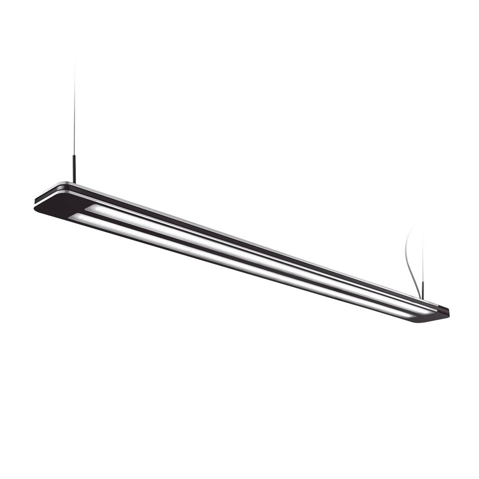 DALI-dimbare LED-pendelarmatuur Trentino II met direct en indirect lichtaandeel Trentino II is een zeer vlakke LED-pendelarmatuur met een directe en indirecte lichtopbrengst die een evenwichtige sfeer creëert in moderne kantoren. Het directe licht wordt uitgestraald door een acryldeksel met kegelvormige verblindingsprisma’s, terwijl de indirecte lichtverspreiding wordt bereikt door helder acryl. De helderheid kan naar wens worden aangepast dankzij de in de kap geïntegreerde DALI-dimmy. Kenmerken – directe (67 % lichtcomponent) en indirecte (33 % lichtcomponent) verlichting voor een evenwichtige sfeer – Verlichtingsunit van hoogglans acryl en aluminium – Roosters voor directe lichtcomponent van prismatisch acryl, voor indirecte lichtcomponent van helder acryl – aluminium plafondkap in armatuurkleur, afdekking zonder gereedschap afneembaar via magneet – Aansluitkabel transparant – eenvoudige schroefmontage – zeer platte constructie – 5-polig klemmenblok – LED-omzetter met DALI-dimmen incl. in de plafondkap