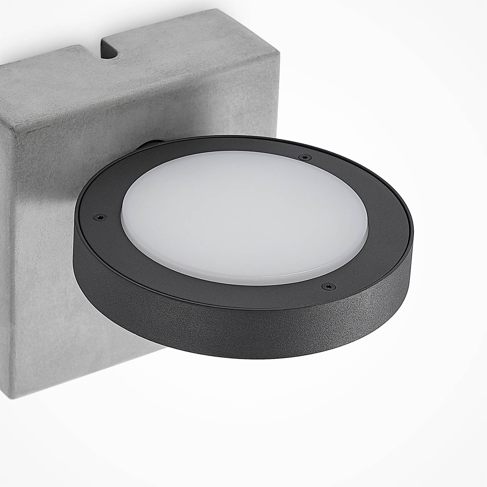 Bewegingsmelder LED buiten wandlamp Belna met ronde lampkop Belna overtuigt met een moderne look en de uitrusting met een ingebouwde bewegingssensor, die het mogelijk maakt de buitenwandlamp op afroep in te schakelen, omdat het licht dan altijd onmiddellijk aangaat zodra er binnen het bereik een beweging wordt geregistreerd. De wandbevestiging heeft een afdekking van beton, die er zeer trendy uitziet, de ronde lichtkop is van aluminium, donkergrijs gekleurd en heeft een diffusorafdekking van witte kunststof, zodat de lichtbundel zacht en gelijkmatig wordt verspreid. Sensorgegevens: – Detectiehoek 120 graden – Bereik 6 tot 10 meter – Instelbare lichtduur, 8 seconden tot 8 minuten – 5 tot 2000 lux