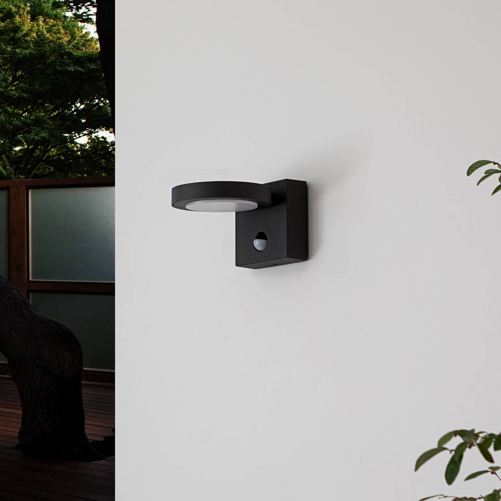Ronde sensor-buitenwandlamp Belna met donkergrijs oppervlak Belna heeft een geïntegreerde bewegingsmelder en is daardoor een bijzonder flexibele lichtbron. Het licht gaat aan zodra beweging in de omgeving wordt gedetecteerd en verlicht vervolgens het gebied, zodat struikelgevaar snel kan worden opgespoord en vermeden. Ongenode bezoekers worden ook afgeschrikt door het licht dat automatisch aangaat. Evenals de wandhouder is de platte lampkop vervaardigd van aluminium en heeft ook deze een donker grafietgrijs oppervlak. De combinatie van een ronde en een hoekige vorm is zeer aantrekkelijk en modern. Gegevens van de bewegingsmelder: – Bereik 6-10 m – Lichtduur instelbaar (8 s – 8 min) – Detectiehoek 120 – 5-2000 lux Afwerking oppervlak: PANTONE 2336C/RAL 840-M