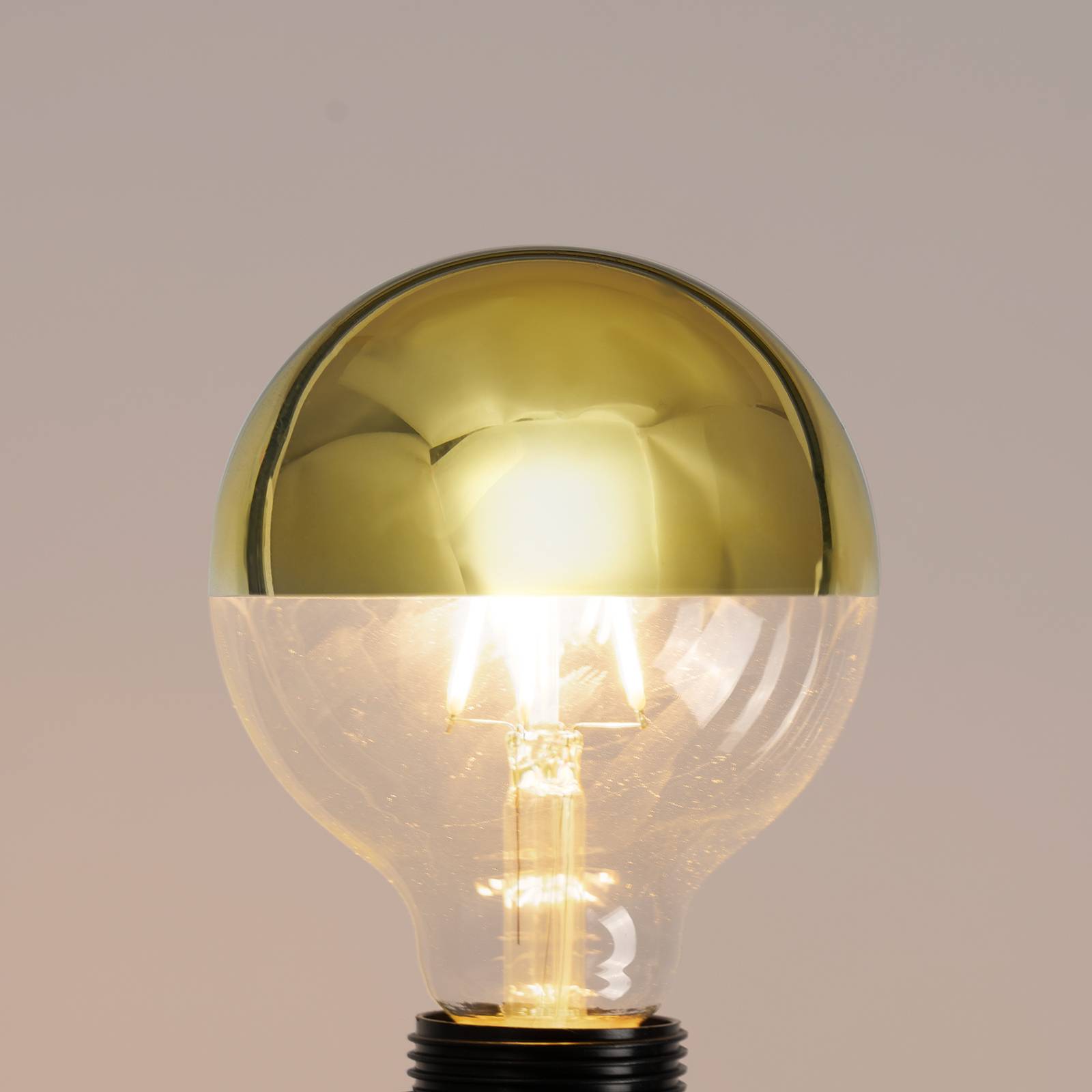 E27 LED gloeilamp, gouden kop met spiegeling, CRI > 90, dimbaar, G95 Deze LED gloeilamp in het G95 design kan op verschillende manieren worden gebruikt in open armaturen, waar de warmwitte lichtkleur en de kop met spiegeling zorgen voor mooi licht met een huiselijk tintje. Dankzij de hoge CRI-waarde worden kleuren zo natuurgetrouw mogelijk weergegeven en de lamp met filamentoptiek is ook dimbaar. Technische gegevens: – G95-design – dimbaar – gouden kopreflectie voor een aangename sfeer – 2.700 K – bijzonder goede kleurweergave, CRI > 90