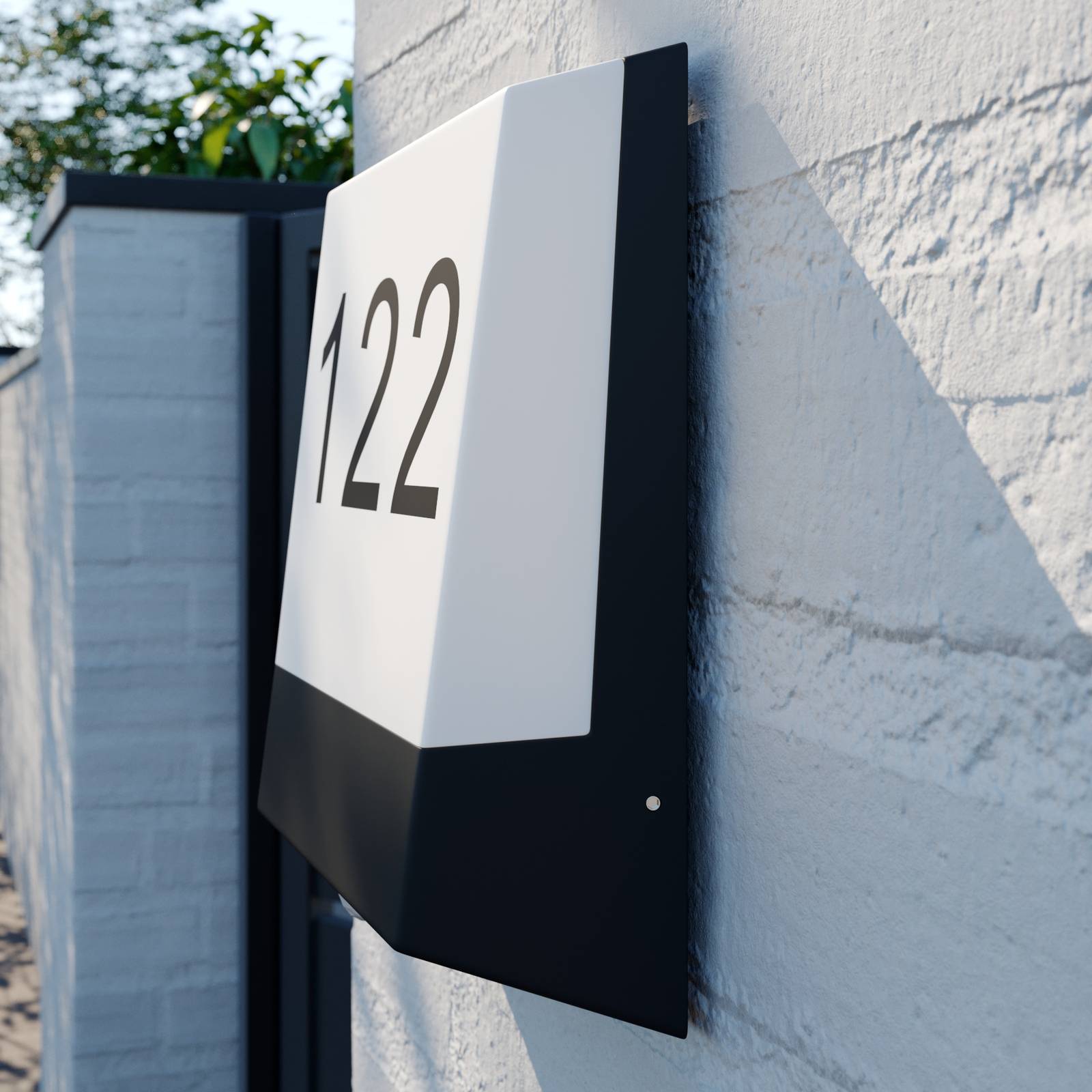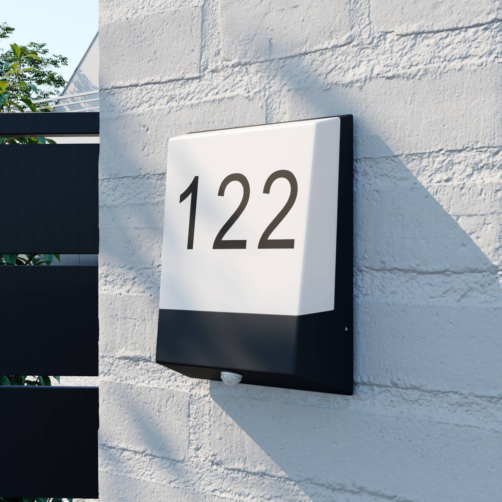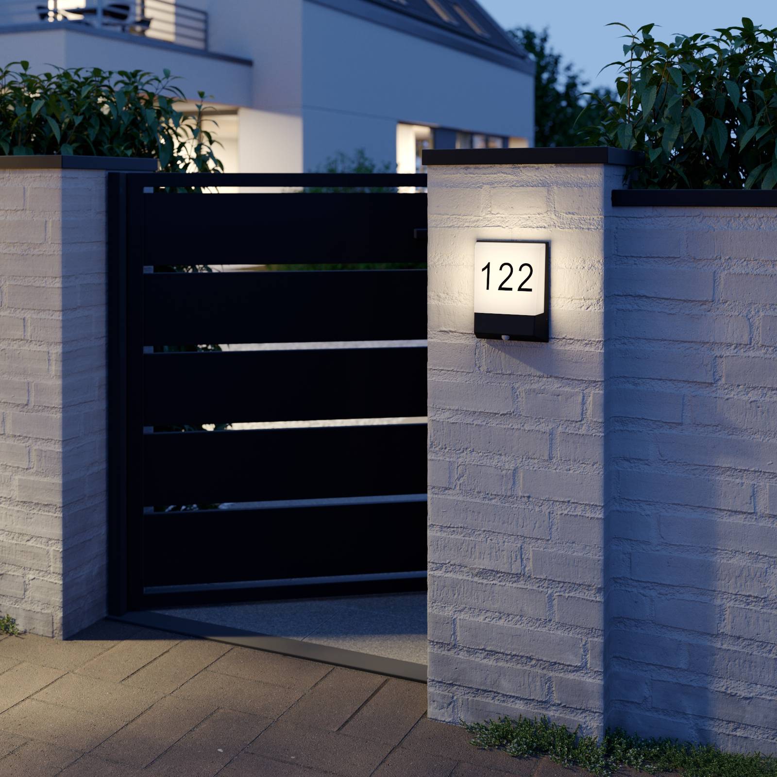 LED huisnummer wandlamp Kosman met sensor De LED-huisnummerverlichting Kosman combineert vele voordelen. De grote, zwarte cijfers komen het best tot hun recht op de witte achtergrond van de lampkap. De infrarood bewegingssensor schakelt het licht aan zodra er iemand in de buurt komt. Enerzijds zorgt dit ervoor dat struikelgevaar tijdig kan worden opgespoord en anderzijds worden ongewenste mensen die niets goeds in gedachten hebben afgeschrikt. Het ontwerp van de Kosman LED-wandlamp is bijzonder aantrekkelijk door de naadloze overgang van het donkergrijs van het frame naar het wit van de hoes. Technische gegevens bewegingsmelder – Opsporingshoek: 120° / 360 – Installatiehoogte: 1,8-2,5 m – Bereik: max. 6 m – Selecteerbare bedrijfscyclus: 5 sec. tot 8 min.