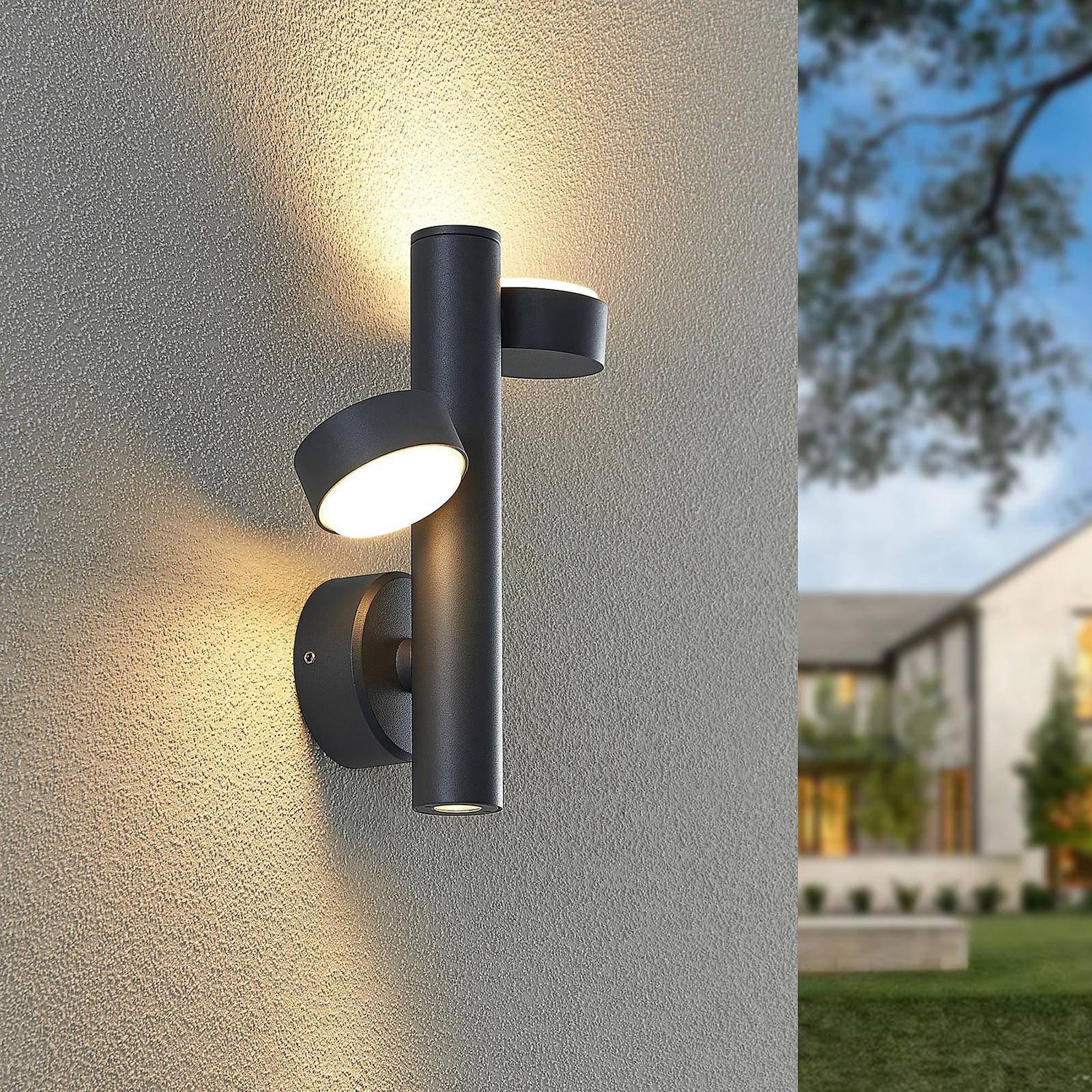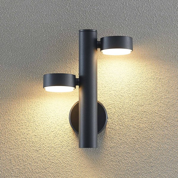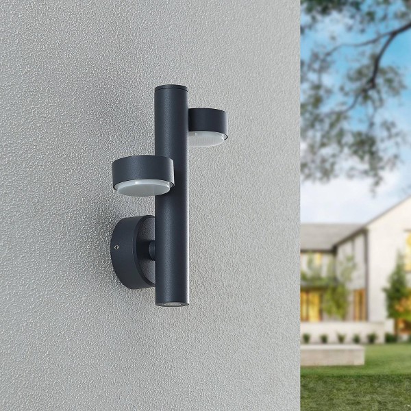 Stijlvolle Kynlee LED wandlamp met twee compacte lampenkappen en een extra lichtbron aan de onderzijde. De LED wandlamp Kynlee is een robuuste en moderne verlichting voor buitengebruik. De behuizing is gemaakt van aluminium en het oppervlak heeft een donkergrijze kleur. Aan de ronde wandhouder is een buis bevestigd, waaraan telkens aan één kant een compacte lampenkap is bevestigd. De LED-wandlamp Kynlee heeft vast geïnstalleerde LED’s die een warm wit licht produceren en een harmonieuze sfeer scheppen voor de buitenruimte. Dankzij de beschermingsgraad IP54 is de armatuur aantoonbaar beschermd tegen stof en spatwater.