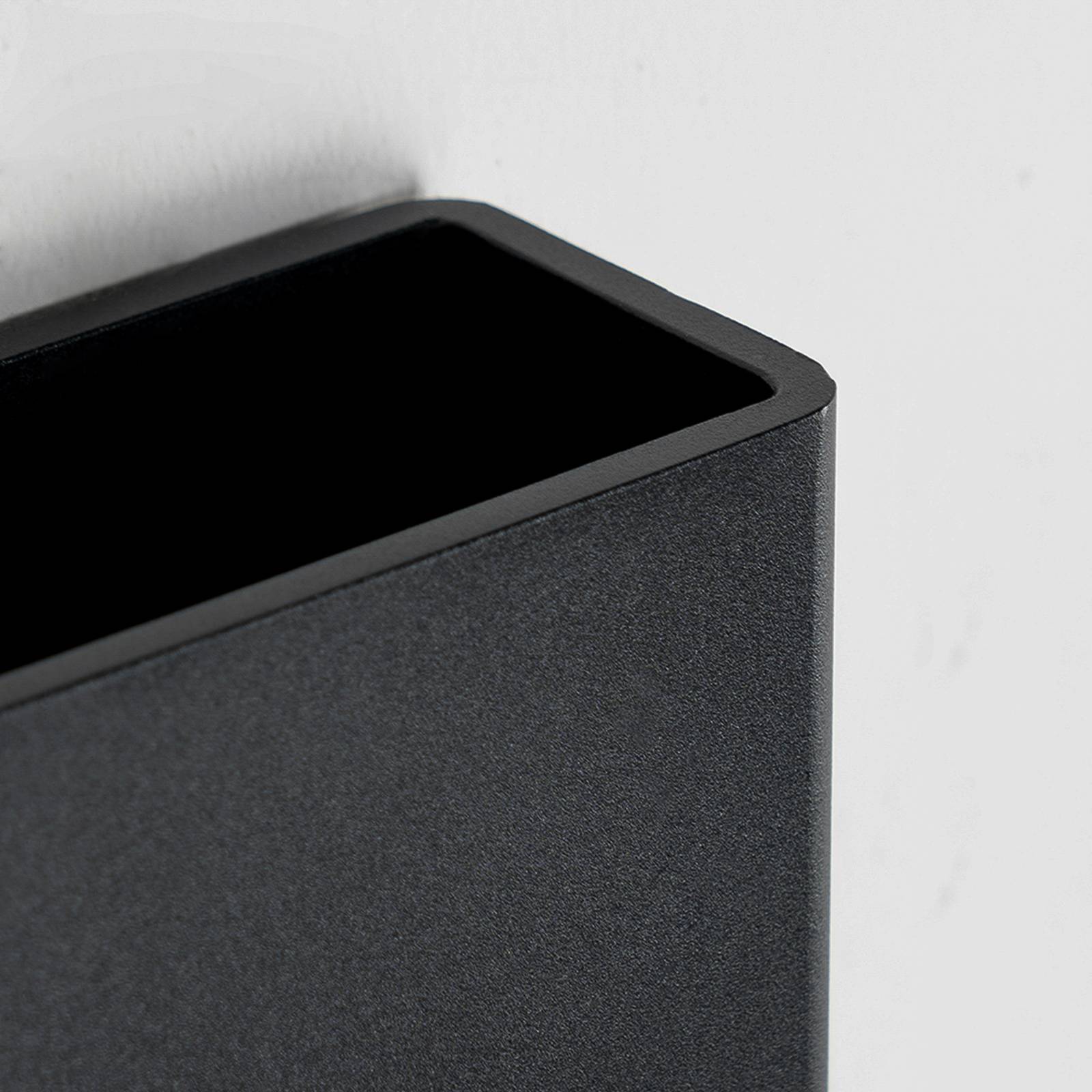 Donkere buitenwandlamp Narivan in geometrisch design De buitenwandlamp Narivan maakt indruk met haar lineaire design in zwart. Het heeft een hoekige behuizing van aluminium, die zeer goed past in een moderne omgeving. De vast geïnstalleerde LED’s zijn helder en geven een warm wit licht dat aangenaam is voor het oog en zeer uitnodigend in de entree of op het terras. Het licht wordt zowel naar boven als naar beneden langs de muur uitgestraald, zodat het voordelig in scène wordt gezet. Dankzij de goede beschermingsgraad is dit armatuur goed bestand tegen weersinvloeden en kan dus lange tijd buiten worden gebruikt.