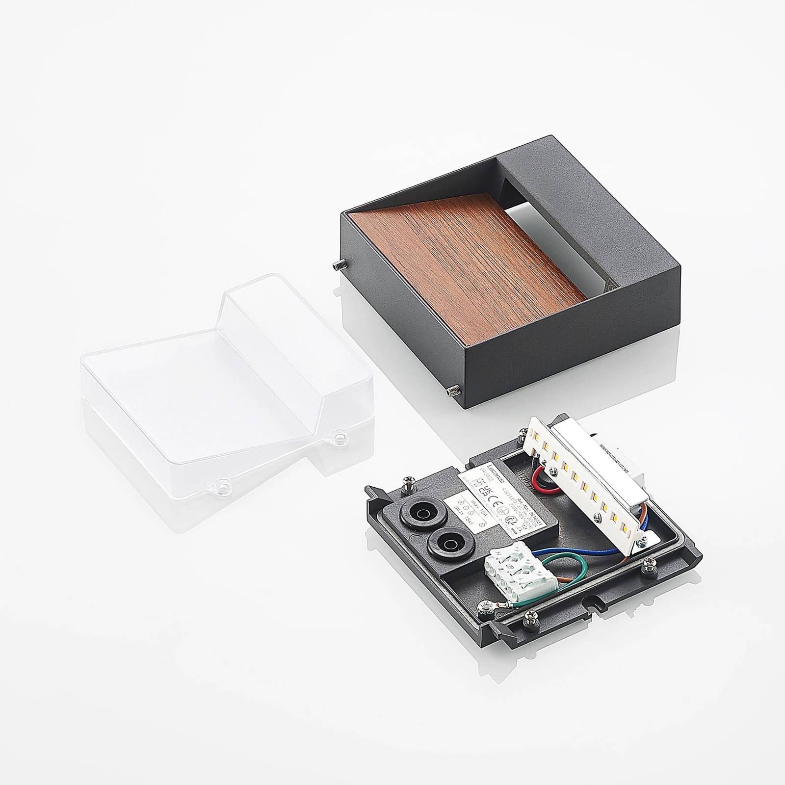 LED buitenwandlamp Sylvett in hoekige vorm, licht naar beneden gericht, houtdecor Deze LED buitenwandlamp is ook goed geschikt voor bijvoorbeeld huisnummerverlichting, om maar een toepassing te noemen, namelijk het licht wordt naar beneden gericht zonder te verblinden en kan daardoor een op de muur gemonteerd huisnummer goed verlichten. De basisvorm van de armatuur is hoekig, met het onderste element licht afgeschuind. Er is een deksel in houtlook, dat mooi verlicht is en een natuurlijke toets geeft aan het totale ontwerp, dat zeer modern oogt. Met zijn hoge beschermingsgraad kan de armatuur zonder aarzeling worden gebruikt rond het huis en op andere buitenlocaties
