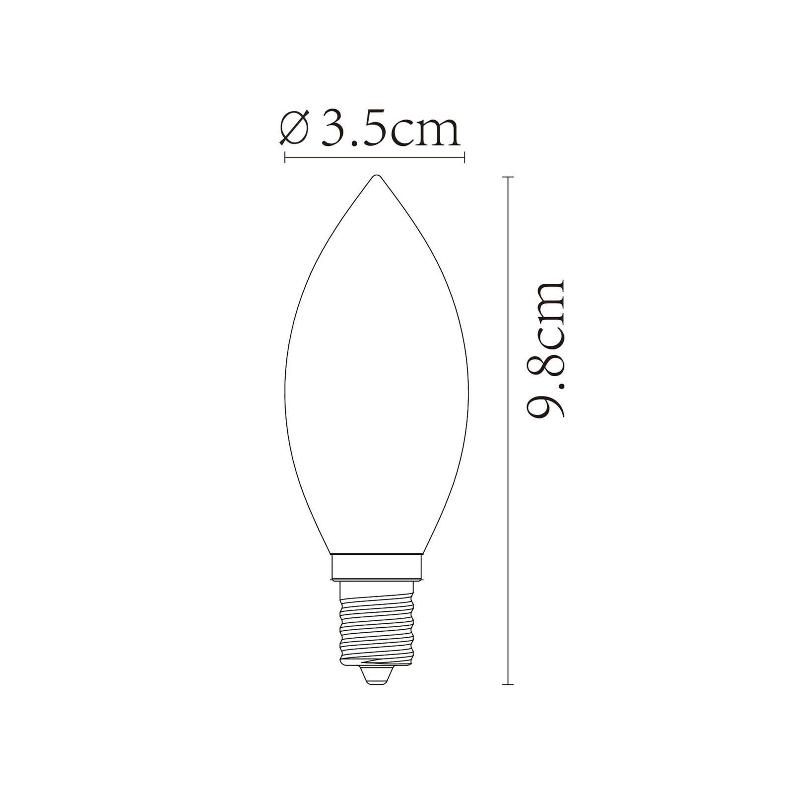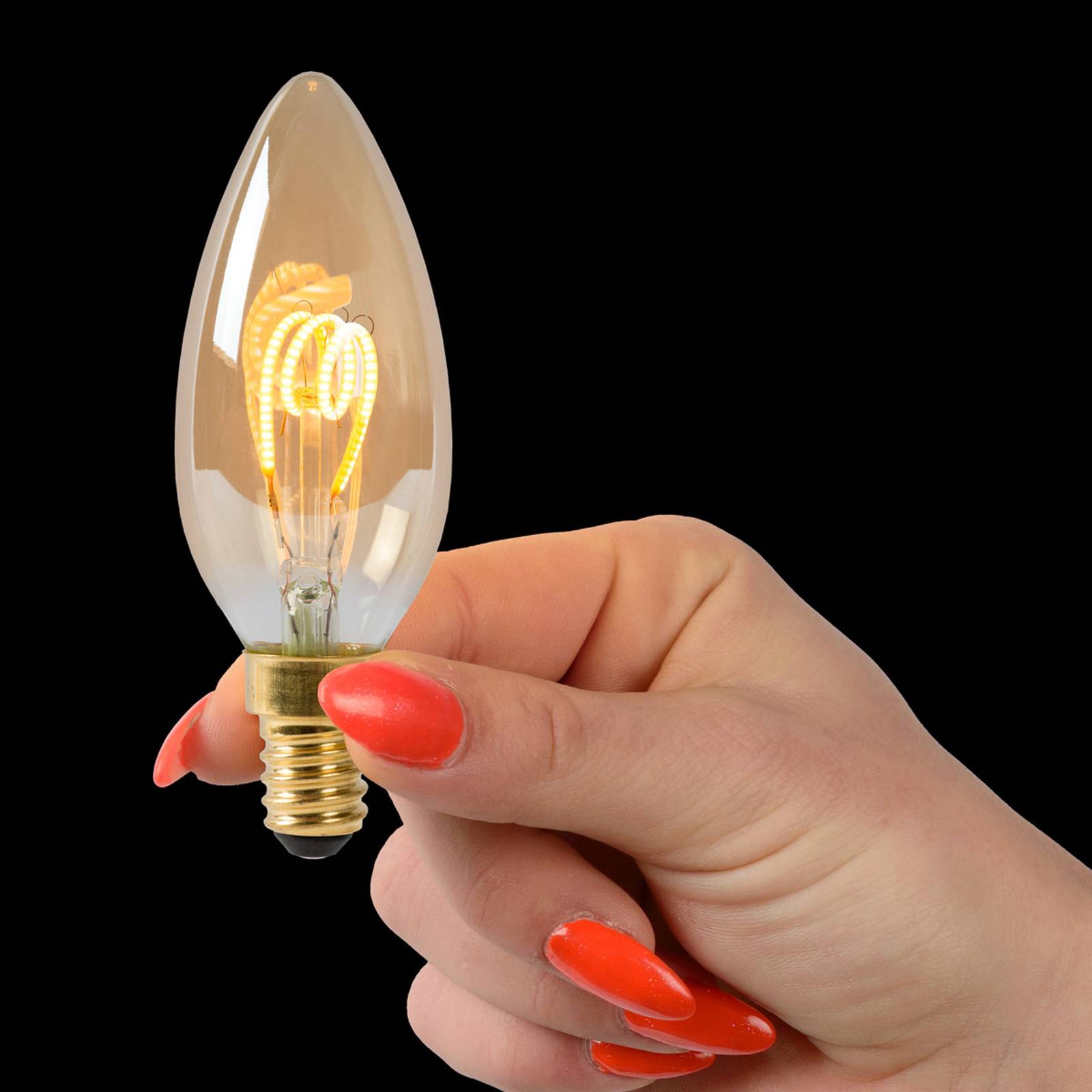 Decoratieve 3 W LED kaarslamp Deze LED lamp is de perfecte keuze als je een warme, sfeervolle ambiance wilt creëren in combinatie met open armaturen. Dit wordt gegarandeerd door de gebogen gloeidraadlook, kaarsvorm, amberkleurig getint Glas en het bijzonder warme licht van 2.200 Mite. Die Lamp is ook dimbaar. Technische gegevens – Energie-efficiëntieklasse: A – Vergelijkingswaarde: 15 W – Dimbaar Speciale kenmerken – Zeer warme uitstraling, decoratieve functie