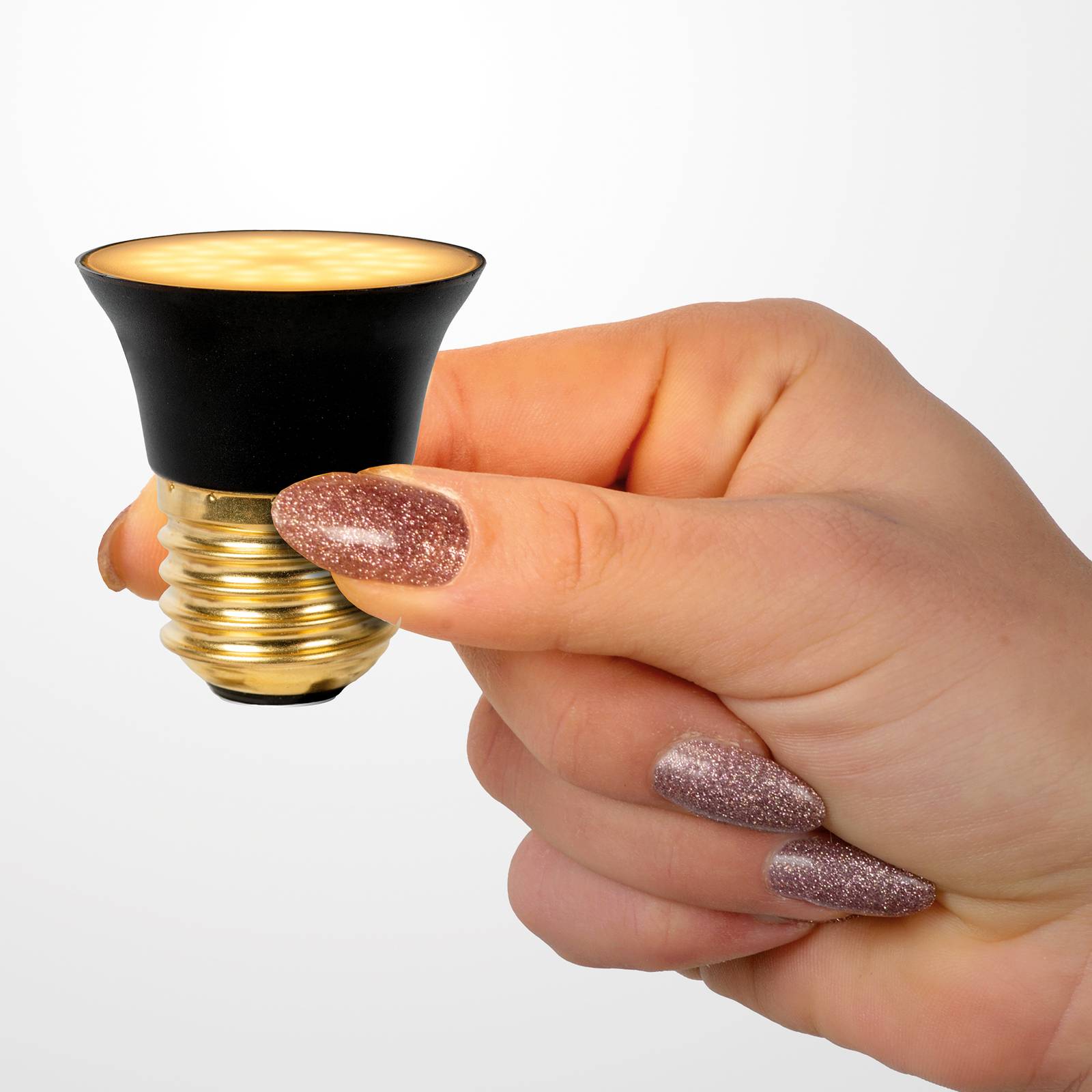 Platte E27 LED lamp in G45 uitvoering, 5 Watt, 3-StepDimDeze LED lamp met E27 lampvoet heeft een platte vorm en presenteert zich in een zwart omhulsel met gouden details. Visueel doet het denken aan een reflector. Het warmwitte licht met 400 lumen kan in helderheid worden aangepast dankzij de 3-StepDim-functie.