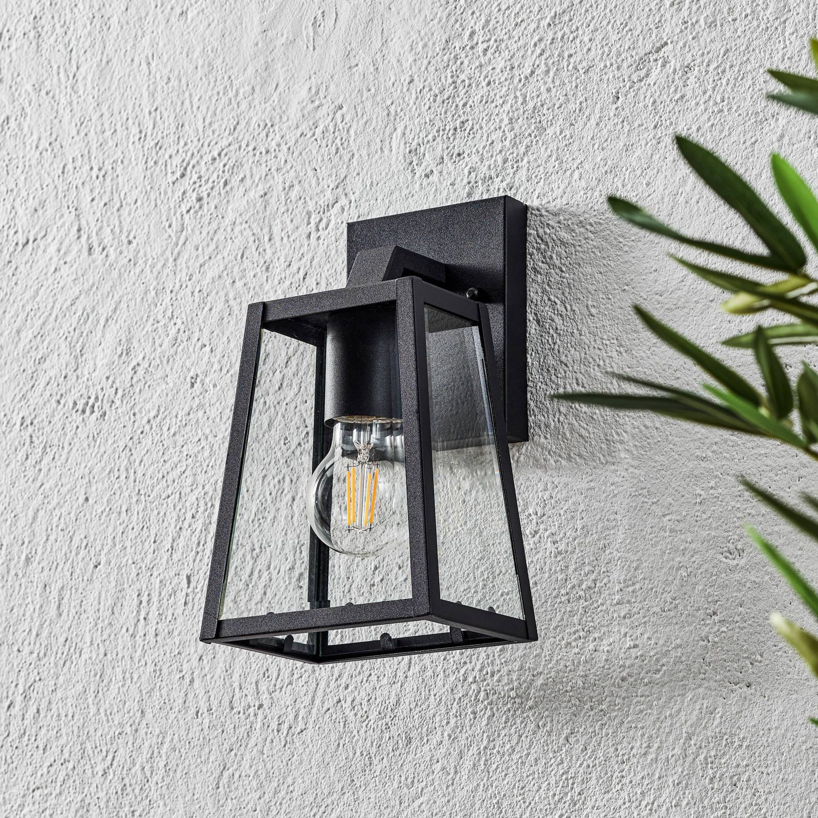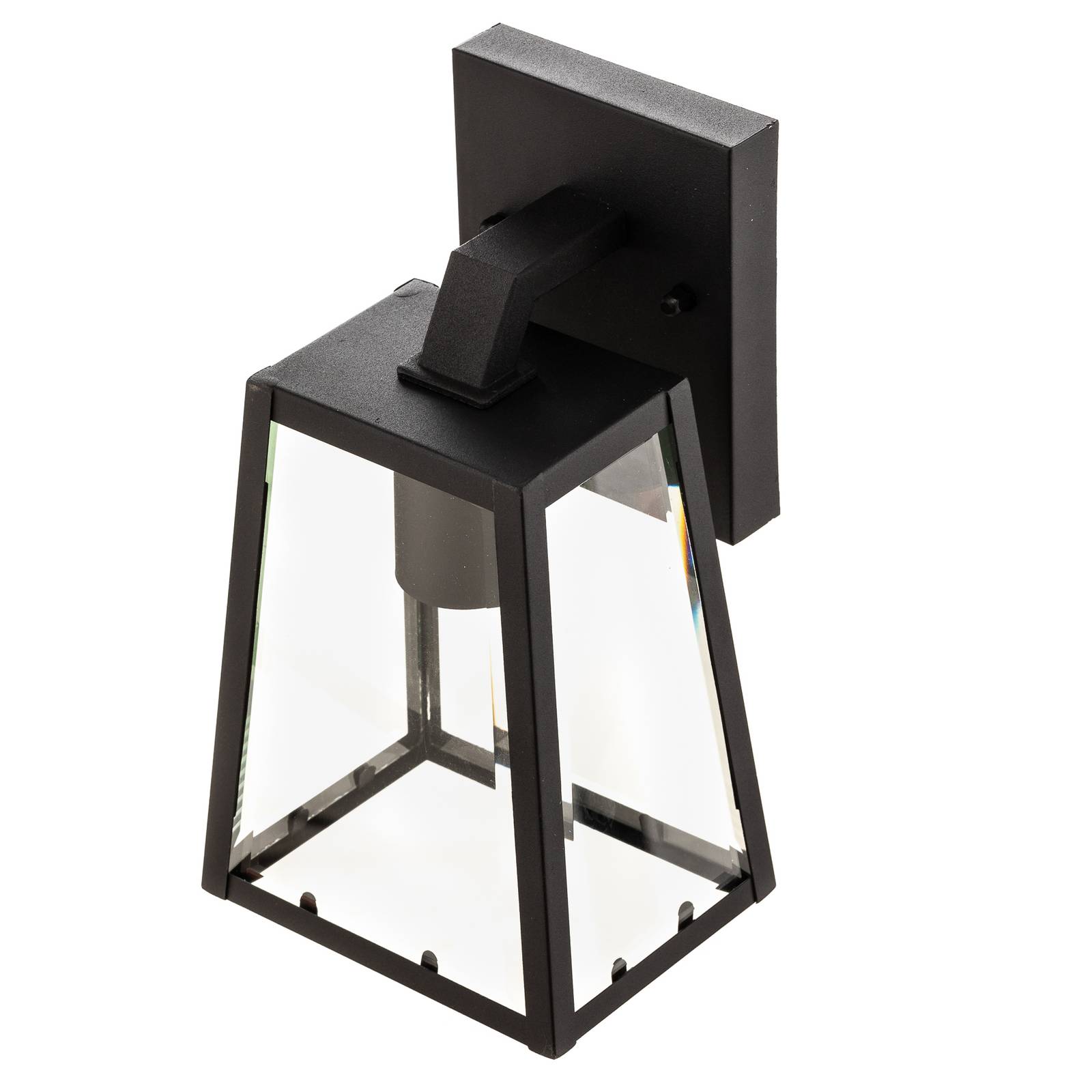 Buitenwandlamp Matslot van matzwart metaal en helder glas De Matslot buitenmuurarmatuur past zowel op de gevel van rustiek ontworpen gebouwen als op de muur van een landhuis of modern gebouw, omdat hij in een zeer rechte lijn uit mat zwart metaal en helder glas is vervaardigd. Zowel de muurbeugel als de kap, die naar beneden toe iets breder wordt en voorzien is van heldere glasplaten met een mooie facetafsnijding aan de rand, zijn in een vierkante vorm gevormd. Het hangt aan een kleine beugel aan de muurbeugel die naar beneden gericht is. Het heldere glas van de kap zorgt voor een goed zicht op de lamp. Om een optisch effect te bereiken zoals het getoonde model, raden wij het gebruik aan van een gloeilamp in een gloeilamp of een rustieke vorm. De verlichting is niet inbegrepen.